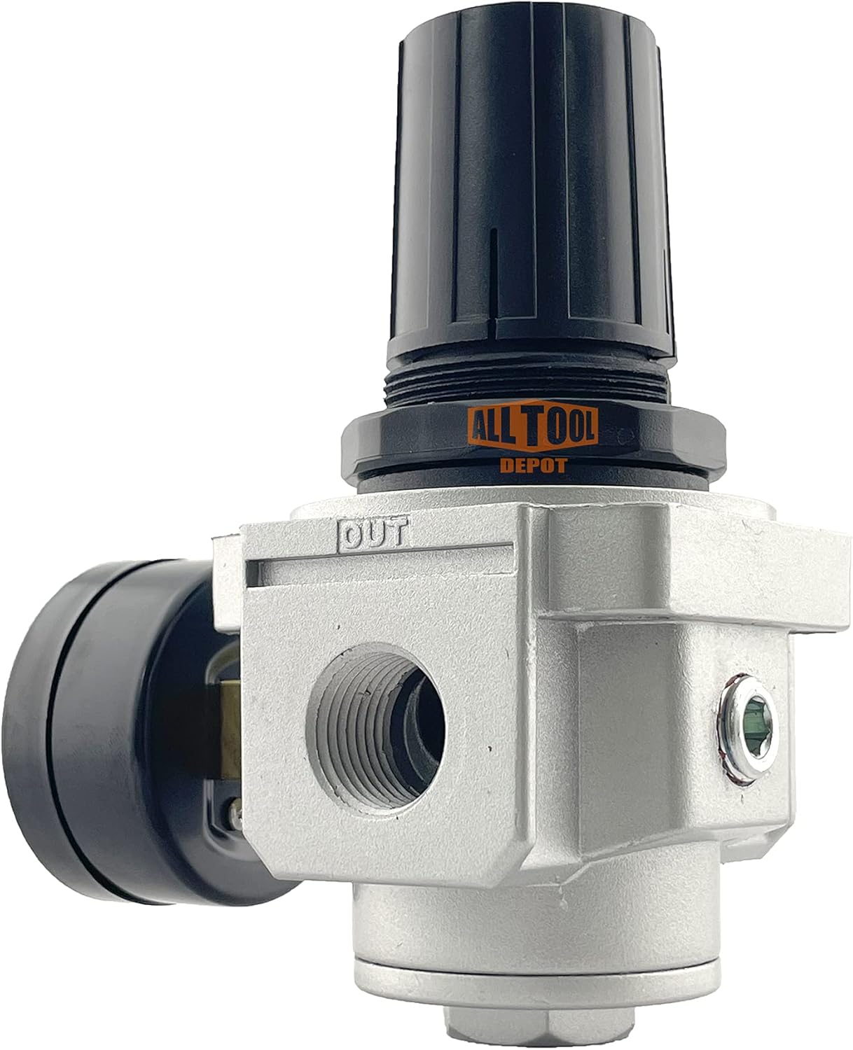 ADJUSTABLE FROM 7 PSI TO 215 PSI, 140 SCFM FLOW RATE A pressure regulator's primary function is to match the flow of gas through the regulator to the demand for gas placed upon it, whilst maintaining a constant output pressure. If the load flow decreases, then the regulator flow must decrease also. If the load flow increases, then the regulator flow must increase in order to keep the controlled pressure from decreasing due to a shortage of gas in the pressure system. High pressure gas from the supply enters into the regulator through the inlet valve. The gas then enters the body of the regulator, which is controlled by the needle valve. The pressure rises, which pushes the diaphragm, closing the inlet valve to which it is attached, and preventing any more gas from entering the regulator. The outlet side is fitted with a pressure gauge. As gas is drawn from the outlet side, the pressure inside the regulator body falls. The diaphragm is pushed back by the spring and the valve opens, letting more gas in from the supply until equilibrium is reached between the outlet pressure and the spring. The outlet pressure therefore depends on the spring force, which can be adjusted by means of an adjustment knob.
