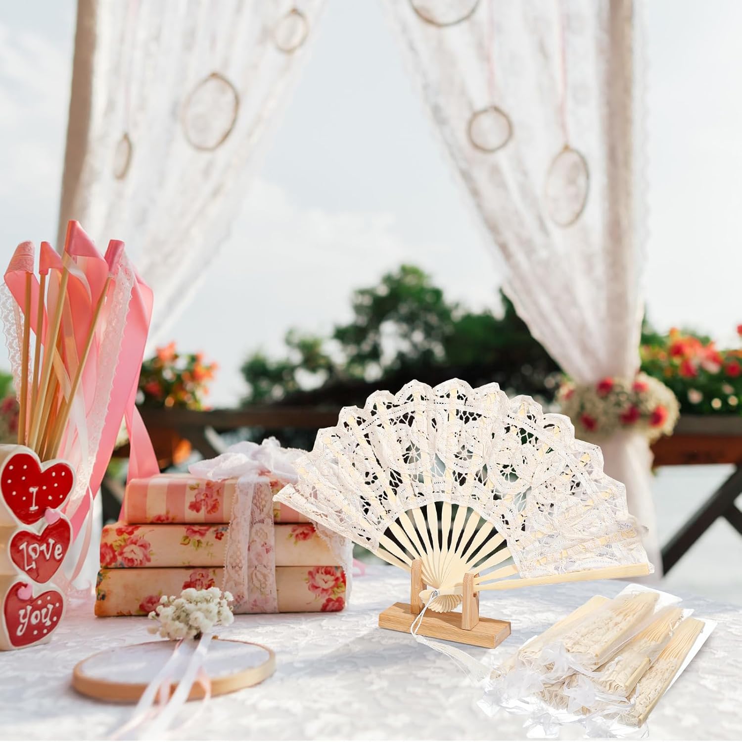 | Included Components | 12 cotton lace folding handheld fans and 12 organza fan bags |