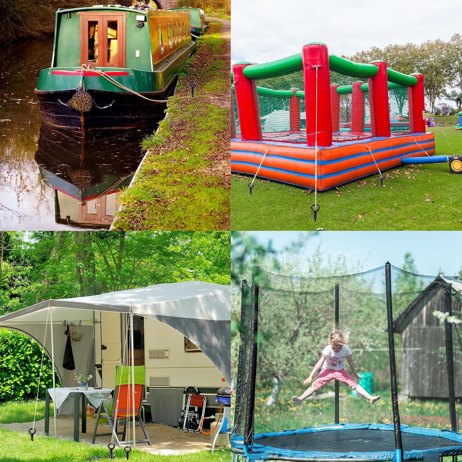 • 【Widely Application】- Heavy duty ground anchors can be used in various scenarios to bind and secure any ground object that is susceptible to strong winds. Including carports, pavilions, garages, trampolines, tents, inflatable castles, fences, mobile homes, camping, trees, amusement park toys, swings, temporary shelters, trap anchors, hurricane bindings, greenhouses, pet houses, tennis nets, etc