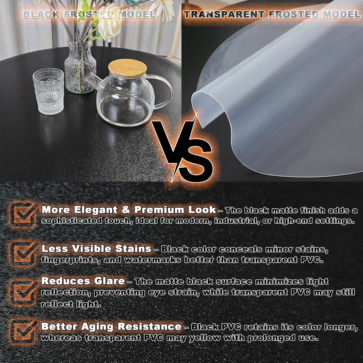 • ◐ Durable & Waterproof: This 2mm Round Black Frosted Waterproof Tablecloth Is Made of High-Quality Pvc, Protecting Your Table from Spills, Stains, And Scratches.