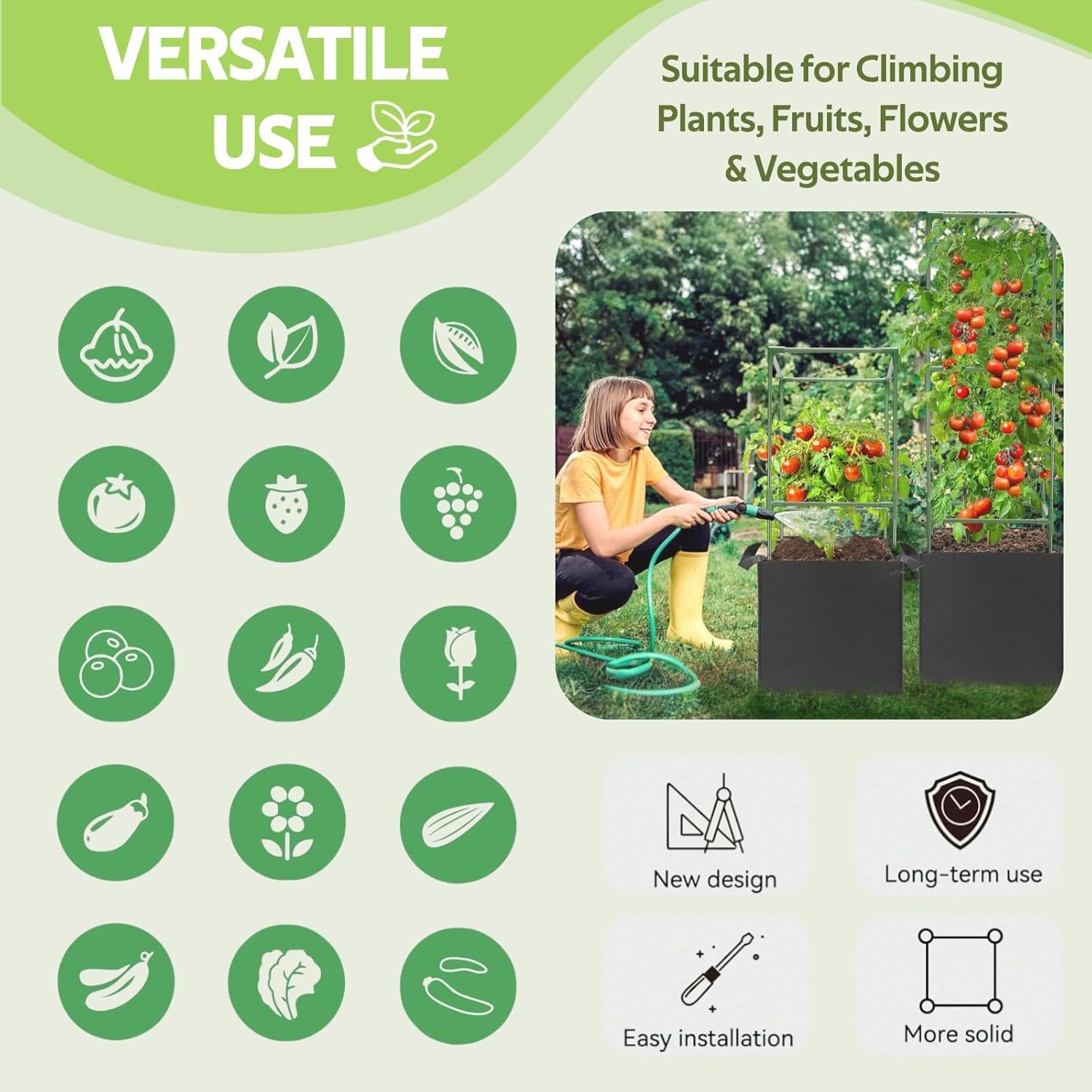 Want to train and support the upward growth of the plants?Elevate your gardening experience with Jesosia Tomato Stakes Kit โ the ultimate solution for robust plant support. This comprehensive kit includes 3 sets of 49-inch tomato cages, offering flexibility in achieving the good height for your plants.FeaturesSolid, weatherproof, and are going to serve you for a long time17-gallon grow bags made of non-woven fabric are sturdyHeight is adjustable as plants growSuitable for all kinds of vegetables, flowers, fruit, succulents, and climbing plants Specification:Quantity: 3 SetsColor: Green, BlackSize: 48" x 15" x 15"The Package: 3 Grow bags, 72 poles, 36 connectors Versatile Growth Options:With the capability to connect two or more stakes, our kit allows you to achieve the desired length for your plants. Easily adjust the height to cater to different growth stages - use a 3-pack for mature plants at 48 inches, a 4-pack at 32 inches for growing plants, or a 9-pack at 16 inches for juvenile plants.Transform your gardening endeavors with the Tomato Stakes Kit - designed for durability, versatility, and healthy plant growth.
