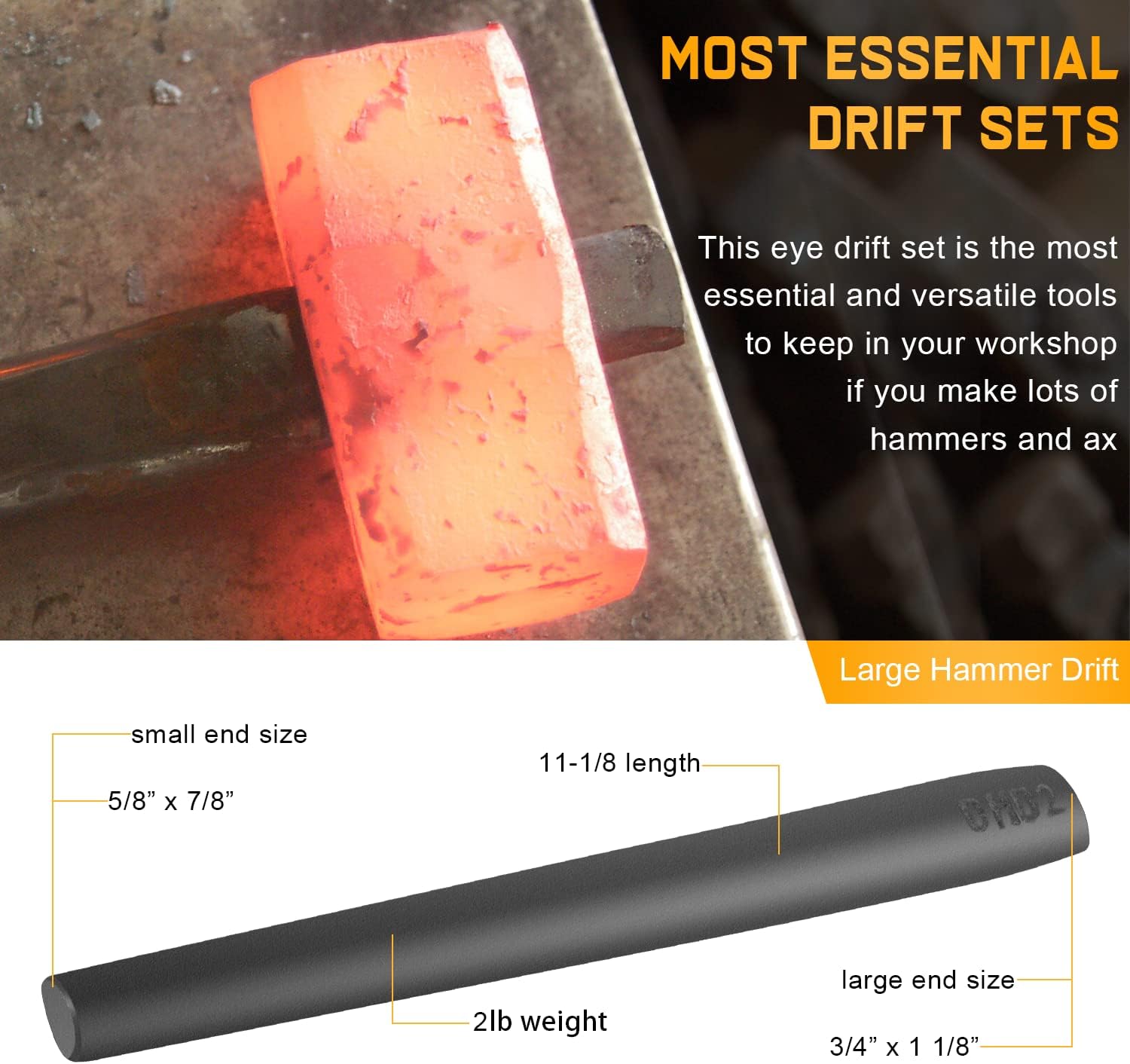 The large Tomahawk drift tool measures 3/8 x 3/4 at the small end and tapers tear drop up to 7/8 x 1 1/4 at the large end. 11-1/4 long 2 lb 5 oz. The large hammer drift tool measures 5/8 x 7/8 at the small end and tapers up to 3/4 x 1 1/8 at the large end. 11-1/8 long 2 lb 2 oz. The mouse ax drift tool measures 5/16 x 7/16 at the small end and tapers up to 5/8 x 7/8 at the large end. 10-5/8 long 1 lb 4 oz