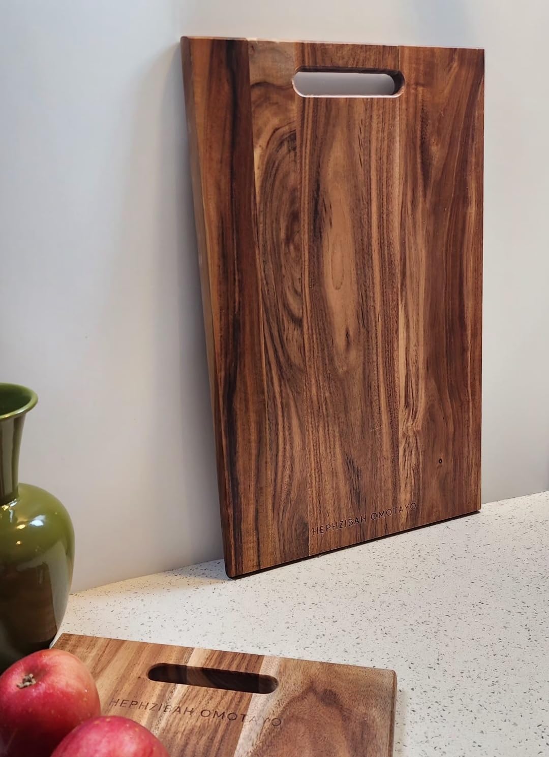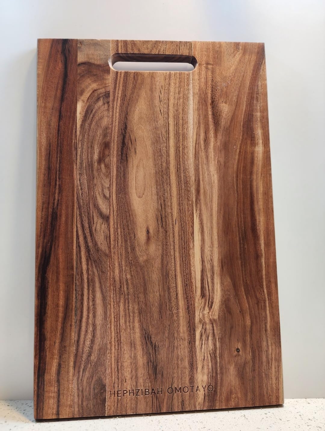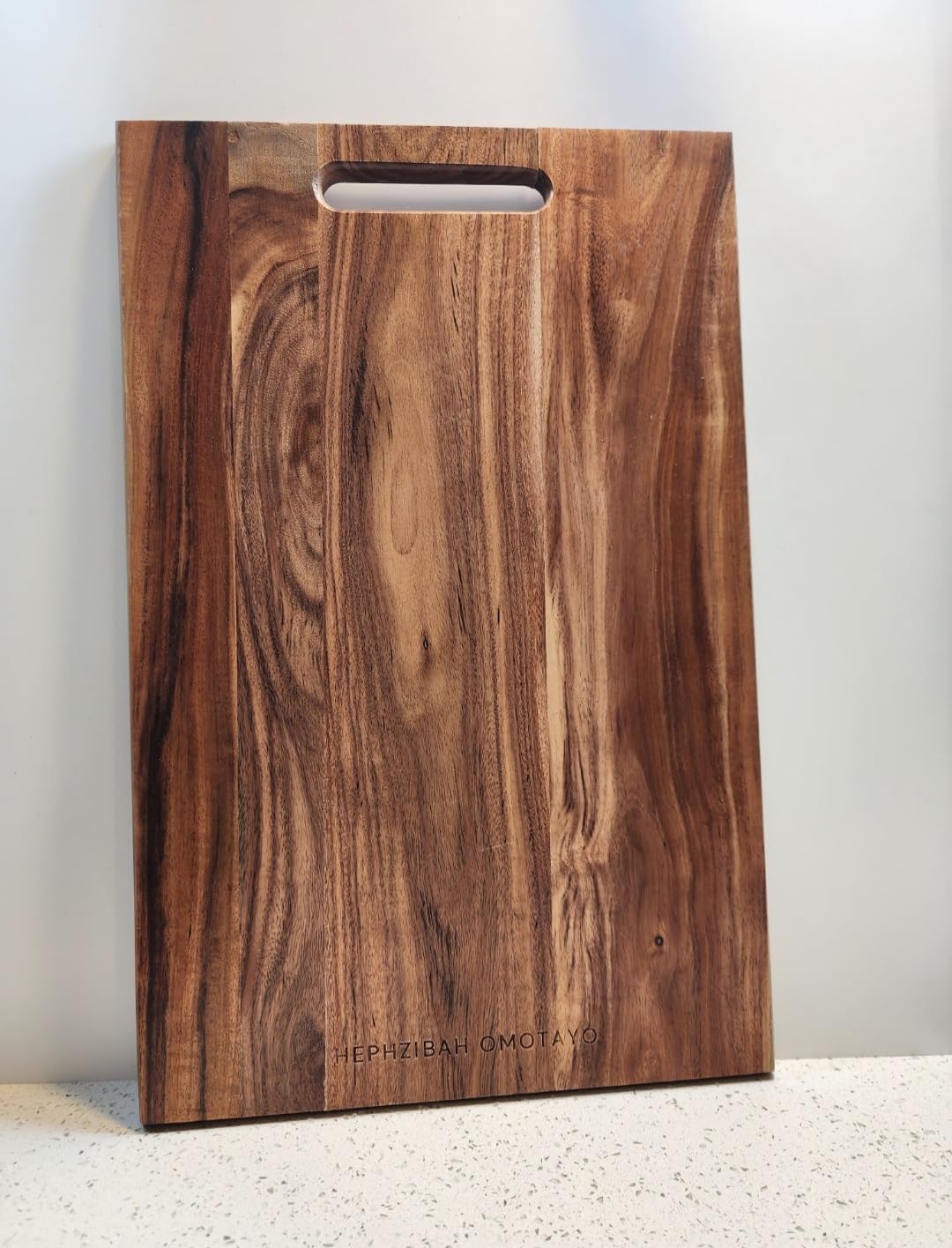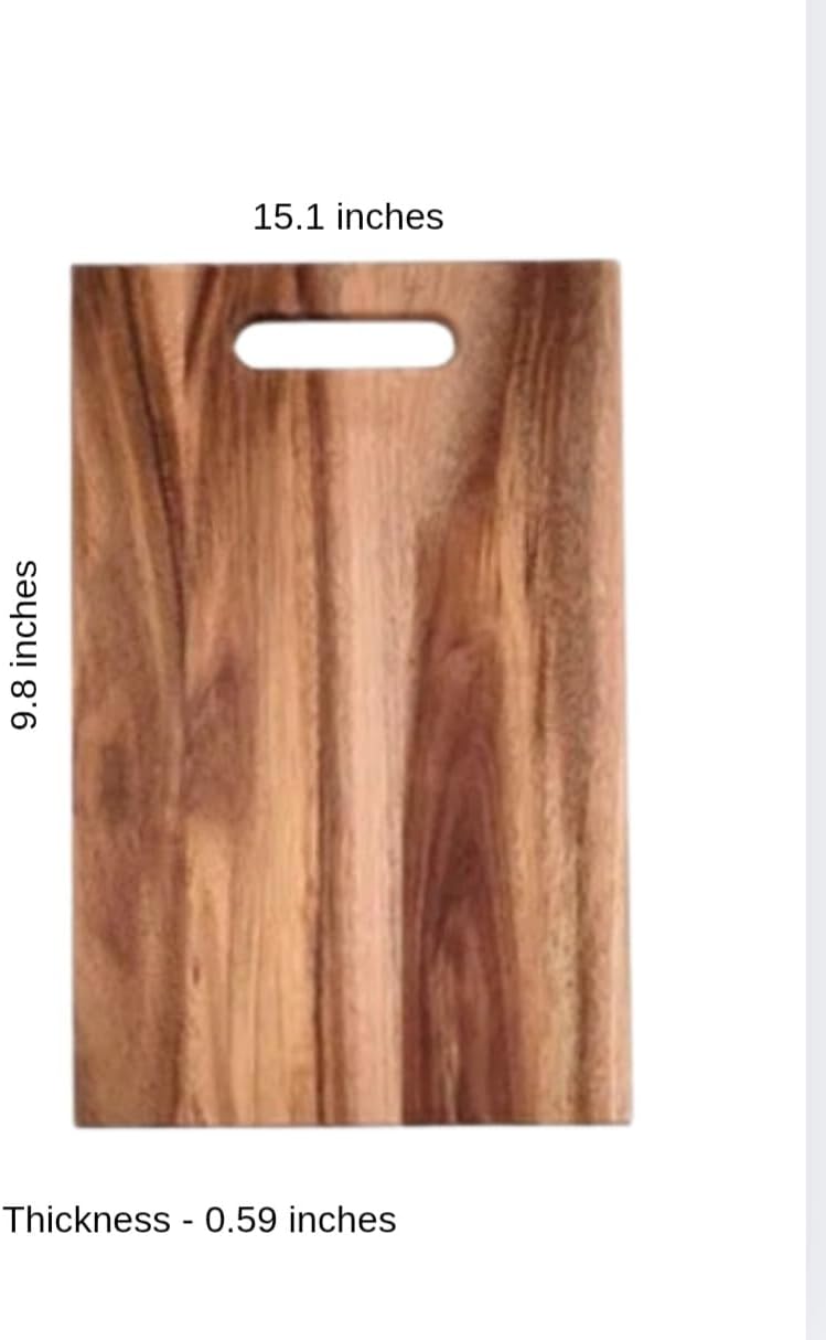 This Acacia wood cutting board is a kitchen essential needed for everyday use. The chopping or cutting board is versatile in functionality. It can used for food preparation - chopping, cutting, slicing, and dicing foods such as vegetables, meat, cheese; for serving, as a charcuterie board or as a platter for appertizers, and desserts at home or for occassions. The large wooden surface provides ample space for all your food preparation needs, from small, simple needs such as chopping vegetables to large needs such as carving meats. The built-in handle makes it easy to carry from counter to table. Its durable construction ensures longevity in your kitchen. It's size and design allow for easy handling, and storage. The size and thickness make it stable during use, preventing unwanted movement while cutting or chopping. Crafted from solid Acacia wood, this board showcases natural grain patterns that make each piece unique. Acacia wood chopping board is durable and long lasting. It is easy to clean - handwash with soap and water after use. With proper care, this versatile cutting board will be a cherished kitchen addition for years to come.