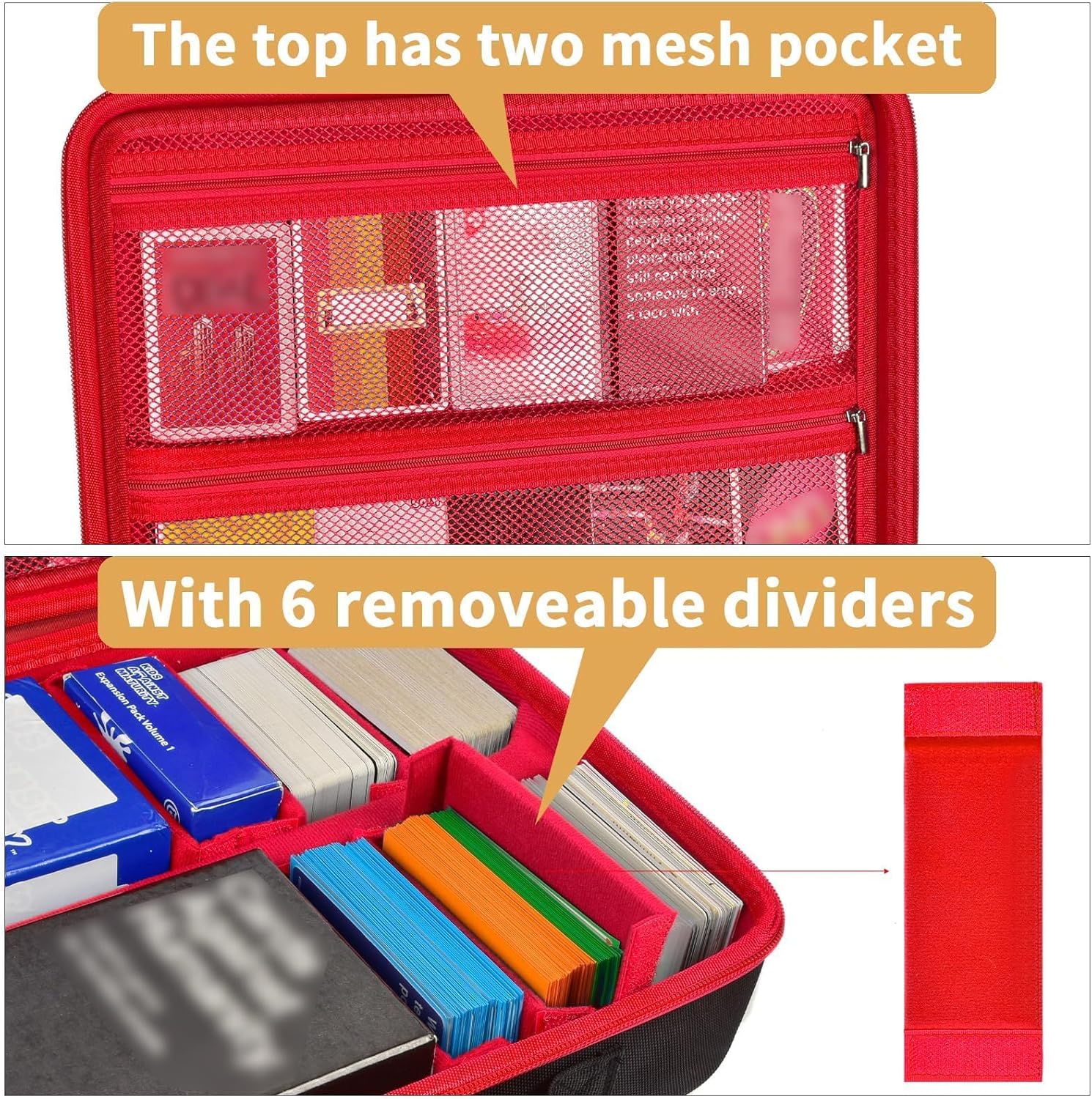 The large for five crowns card game case can be used to store all the card games scattered on the drawers and shelves, you never have to worry about the loss or damage of the cardsThe large trading card case is not only suitable for storing board games for family night at home, but also convenient for you to carry to travel/ camping and other outing activities, and spend happy game time with family/ friendsThe large card storage case is not only limited to drinking games for adults party, it can be used effectively according to your needs. Product advantages(1) Large for cards against humanity case with huge capacity, which can holds 2500+ cards, suitable for all standard card games(2) The hard-shell large trading card box made of EVA special material is waterproof, scratch-proof, shock-proof and dust-proof, so that the card is protected from damage(3) 6 pcs removable velcro, which can adjust or separate different types of game cards(4) There are 2 pcs mesh pockets inside the for yugioh deck box, which can store other cards/ manuals or other game accessories(5) Sturdy handle and adjustable shoulder strap, convenient to carry playing card case for travel/ camping, is one of the best presents5. Package contains1*Large playing card holder1*Adjustable shoulder strap6*Dividers(Only for magic card storage box and shoulder strap, excluding adult games cards)