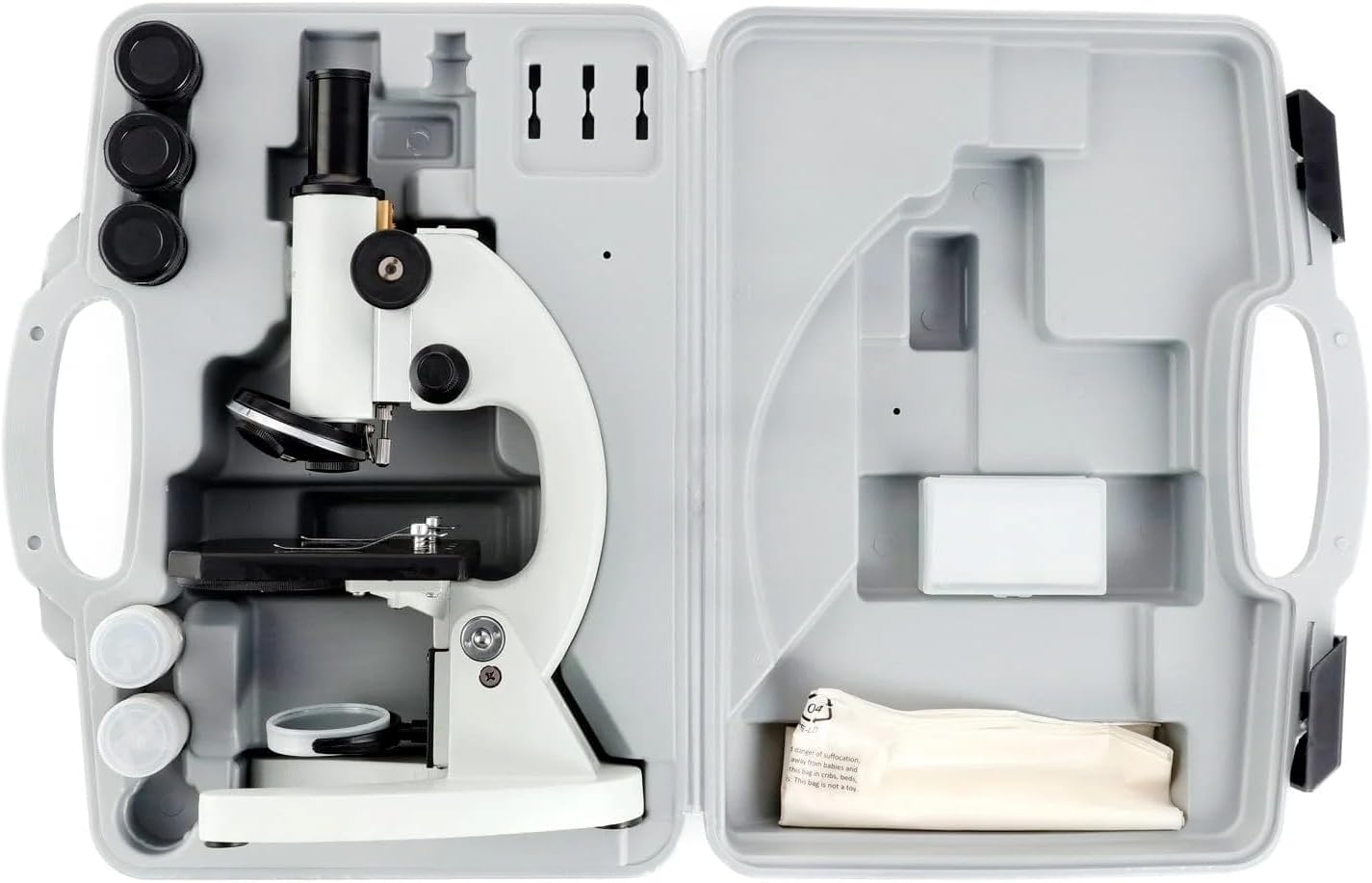 The AmScope M60C-ABS-PS25-WM monocular compound microscope has 10x widefield and 20x widefield eyepieces, a forward-facing nosepiece with three DIN achromatic objectives, Brightfield mirror illumination, a 0.65 NA single-lens condenser, and a plain stage. The forward-facing revolving nosepiece has 4x, 10x, and 40x DIN achromatic objectives that provide color correction of magnified images. The monocular viewing head holds the WF10x or WF20x eyepiece on a fixed upright inclination. A compound microscope is used for inspection and dissection of specimens when two-dimensional images are desired.The microscope has lower (diascopic) Brightfield illumination that transmits light up through the specimen for enhanced visibility of translucent and transparent objects. Brightfield (BF) illumination allows the specimen to absorb light, resulting in a dark image on a light background. A mirror directs light onto the specimen without the need for power or batteries. The 0.65 NA single-lens condenser and disc diaphragm control the amount of light illuminating the specimen. The plain stage has an opening for light transmission and stage clips to secure the slide or specimen in place while viewing. A stage stop prevents the stage or specimen from coming into contact with the objectives. The solid-metal frame has a stain-resistant enamel finish for durability, and a hard-sided plastic case protects the microscope during storage or transport. The microscope comes with a set of 25 prepared slides of a variety of plants, minerals, and animals; and the World of the Microscope book.SpecificationsHeadCompound monocularEyepiecesWF10x, WF20xObjectives4X, 10x, 40x DIN achromaticStagePlainLighting configurationTransmitted (lower)CondenserSingle lensDiaphragmDisc diaphragmLight sourceMirrorIllumination typeBrightfieldPowerN/AMicroscopes are instruments used to enhance the resolution of an object or image. Types include compound, stereo, or digital. Compound microscopes use a compound optical system with an objective lens and an eyepiece. Stereo microscopes show object depth in a three-dimensional image. Digital microscopes are used to display an image on a monitor, rather than looking through a lens. Microscopes can have monocular (one), binocular (two), or trinocular (three) eyepieces, with varying magnification abilities. Magnification ability refers to the size of an image. Resolution, also known as resolvant power, refers to the clarity of the image. The interaction between field of view (FOV), numerical aperture (NA), and working distance (WD) determines resolution. Microscopes can control magnification through a fixed focus, or through a range of adjustments. They can also utilize LED, fluorescent, and mirror light sources to help control viewing capabilities. Microscopes are widely used in education, lab research, biology, metallurgy, engineering, chemistry, manufacturing, and in the medical, forensic science, and veterinary industries.United Scope manufactures microscopy equipment and accessories under the brand name AmScope. The company, founded in 1996, is headquartered in Irvine, CA.What's in the Box?AmScope M60C microscope with plain stageWF10x eyepieceWF20x eyepiece4x DIN achromatic objective10x DIN achromatic objective40x DIN achromatic objectiveSet of 25 prepared slides (2) Stage clipsWorld of the Microscope bookCarrying caseInstructions