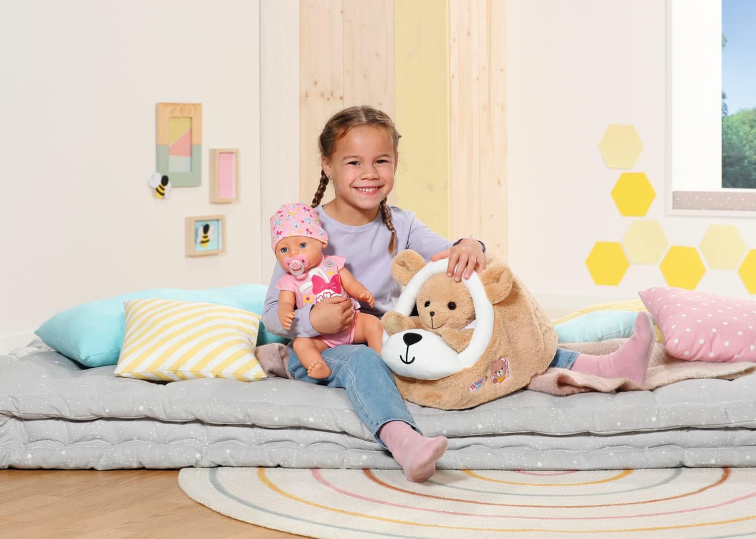 BABY born lives in a child’s room and has her own little bed. Of course the BABY born Bear also has a home and somewhere to sleep – for a bear it is called a cave. The plush bed is in the shape of a bear’s head, and is decorated with adorable ears. The entrance looks like a friendly bear face. The inside walls of the cave are pink and printed with cool elements. It is the perfect hiding place for the little bear to snuggle down and hibernate for the winter – or perhaps just take a nap.