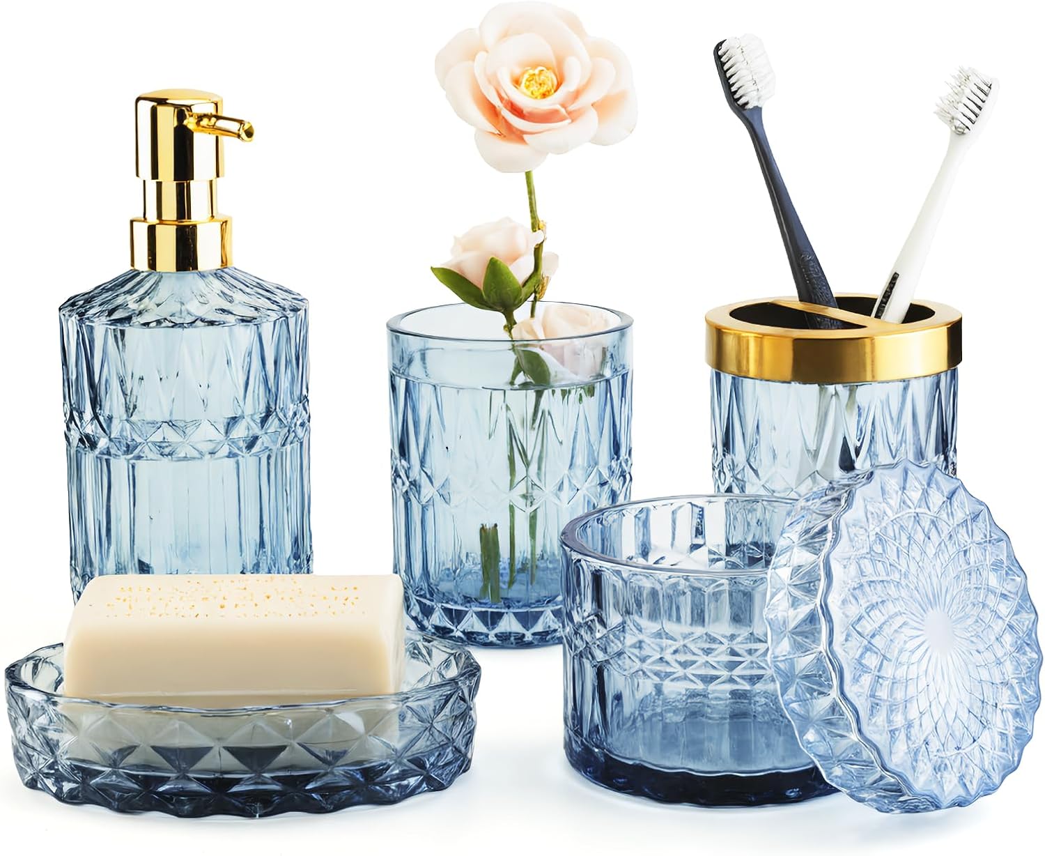 Bathroom Accessory Set 5 Pcs, Glass Bathroom Set Include Soap Dish, Toothbrush Holder, Mousewash Cup, Soap Dispenser, Cotton Swab Jar, Amber