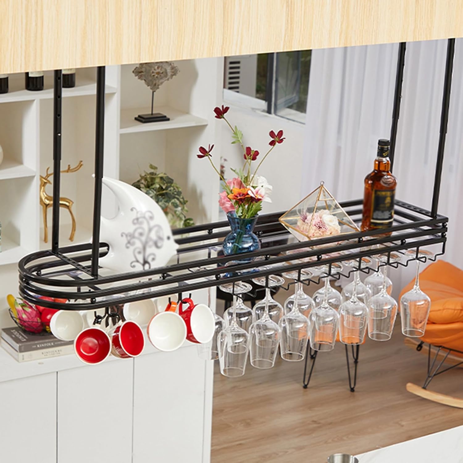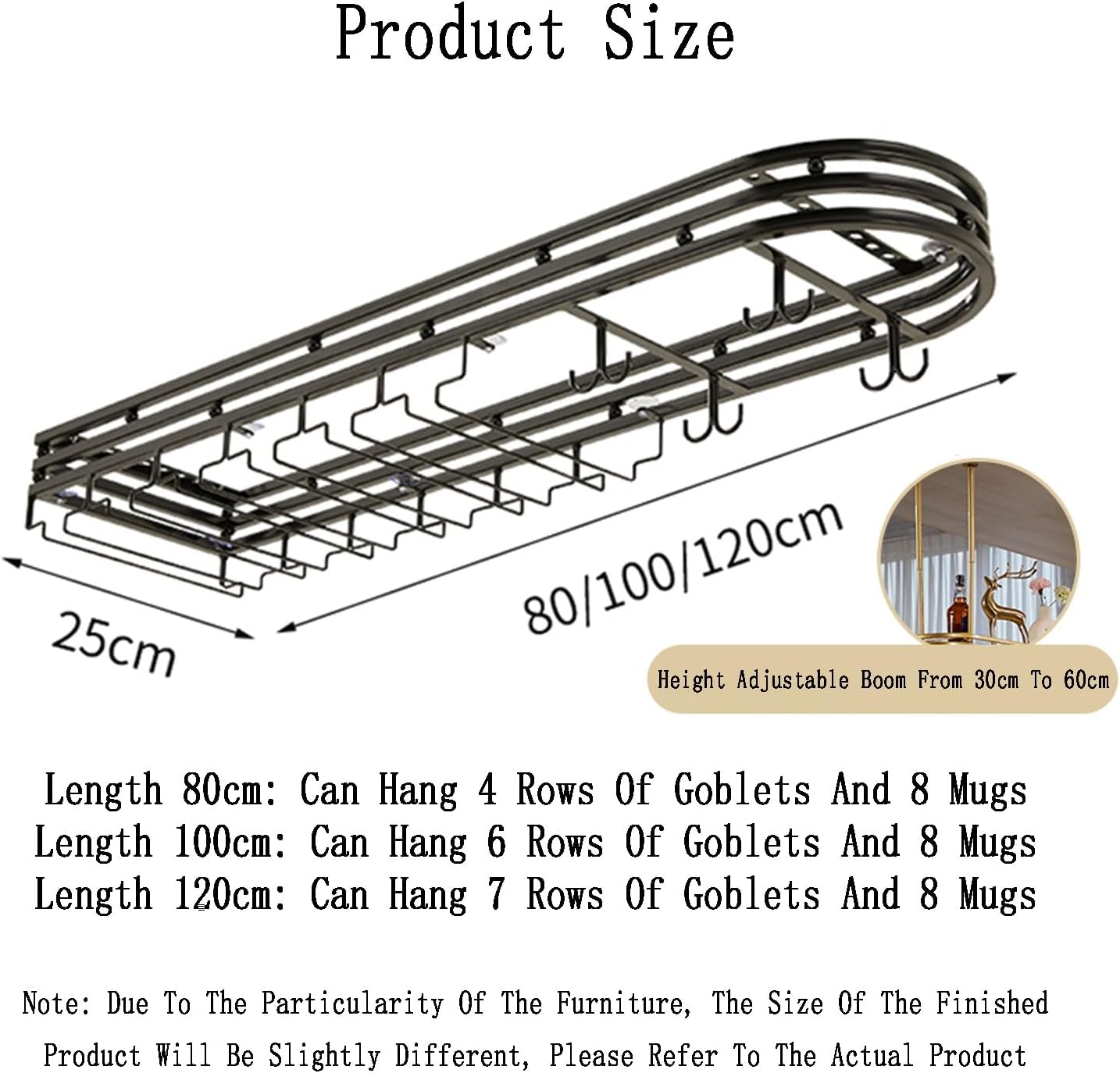 DESCRIPTION:If you are a wine lover, you definitely a wine rack that can both store your collection and display beautiful glasses. This ceiling wine glass rack fulfills that desire. 1. Load Capacity: Our rack is to hold a large number of wine glasses securely, so you can confidently display your collection.2. Universal Goblet Holder: The rack accommodates various types and sizes of wine glasses, making it a versatile choice for any wine-lover.3. Easy to Install: With our user-friendly design, installation is a breeze. Simply follow the provided instructions and use the included mounting accessories for a hassle-free setup.4. Wide Application: This rack is perfect for numerous settings, from intimate family gatherings to bustling wine-tasting events.PRODUCT SPECIFICATIONS:Name: wine rackMaterial: ironColor: Black , GoldFunction: LiftableAssembly Required: YesFeatures: heavy-duty, durableSize: length 80/100/120cm, width 25cmPACKAGE INCLUDES:1 x Ceiling wine rack1 x Mounting accessories and user's GuideNOTES:1.This product is not suitable for plasterboard ceilings as plasterboard does not have enough load-bearing capacity. Customers whose ceilings are cement board or wood board, please buy it with confidence.2.This product does not include wine glasses and other decorations.3.Please allow the slight color difference caused by the shooting light and the 1-3 cm error due to manual measurement, and make sure you do not mind before ordering.NOTICE:If You Have Any Questions, Please Contact Us And We Will Provide A Satisfactory Solution Within 24 Hours