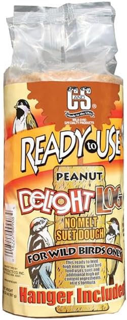 Make any hanging spot in your garden a bird feeding station with these C&S Ready-To-Use Peanut Delight Suet Logs. Package of 8 preformed, individually wrapped suet logs delight your backyard birds Each log has a plastic base and hanging ring for placement on a hook in moments Corn, peanuts, and oats within the suet base create a flavorful treat for birds Each log is wrapped for easy storage and to maintain freshness High fat content of the suet helps maintain high metabolisms in birds Set of 8 makes it easy to create a few feeding stations throughout your yard A fantastic alternative to feeding seed Made in the USA. Note: This case pack contains 8 of the C&S Ready-To-Use Peanut Delight Logs, 15.5 oz. each. Birds that use these logs: bluebirds, chickadees, flickers, grackles, jays, kinglets, mockingbirds, nuthatches, orioles, starlings, tanagers, titmice, towhees, warblers, woodpeckers, and wrens Ingredients: corn, roasted peanuts, rendered beef suet, oats, and soybean oil Guaranteed Analysis: minimum crude protein 7%, minimum crude fat 20%, and maximum crude fiber 5% Weight: 15.5 oz. each Dimensions: 2.25" dia. x 5.75"H each Mounting: may be hung Construction: suet, plastic
