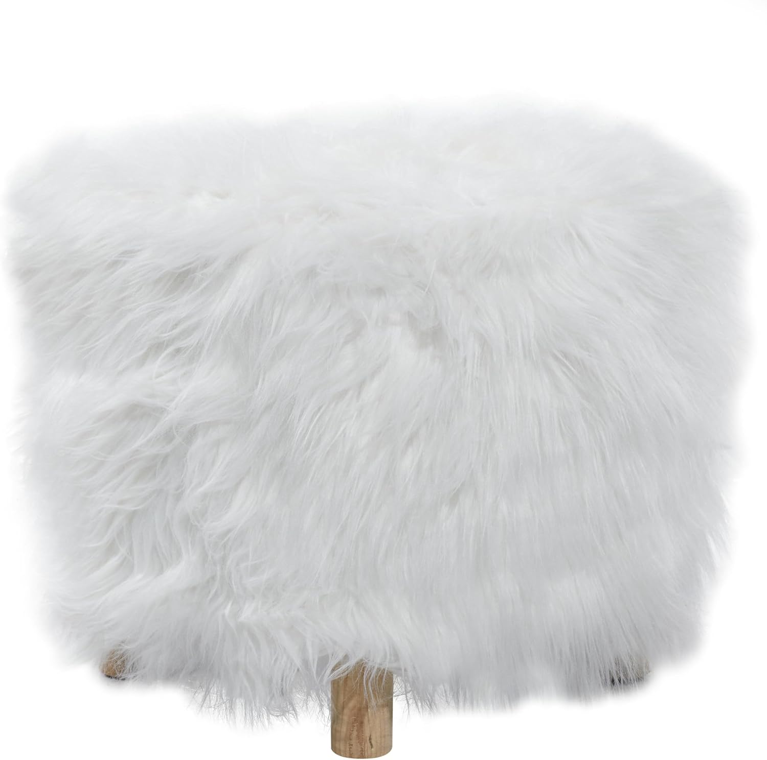 The contemporary ottoman foot rest is constructed with faux fur wrapped on the sturdy pine wood frame, creating a durable structure. The textured white chair stool showcases an appealing faux fur design throughout its round exterior, adding sophistication to any room's décor. Wipe clean with a dry cloth. Enhance your contemporary style living room with this luxurious white ottoman that offers both style and comfort. This item ships in 1 carton. Suitable for indoor use only. This item ships fully assembled in one piece. Maximum weight limit is 250 lbs. This is a single white colored ottoman. Contemporary style.