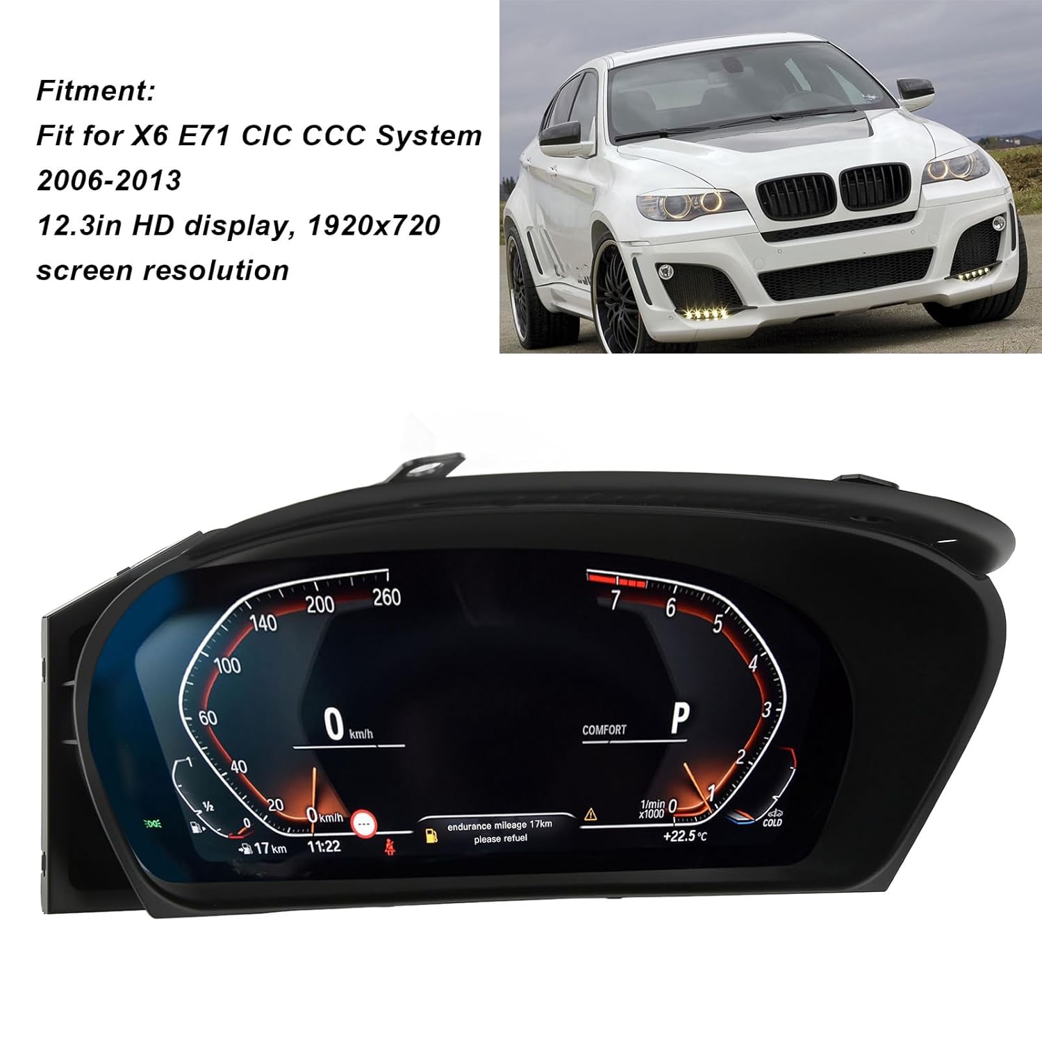 1. Applicable Model: Digital dashboard gauge meter fit for X6 E71 CIC CCC System 2006‑2013. Working voltage 9V‑16V. Current 0.8A‑1.5A. 2. LCD Display Screen: 12.3in HD display, screen resolution 1920x720. With classic, sporty, off road UI style, make your car more cool, upgrade your car perfectly. 3. Oil Water Gauge: Digital dash gauge display oil temperature, water temperature, oil pressure, tire pressure, support body balance and other functions. 4. Excellent Performance: Support for LINUX system, 4 core CPU, main frequency 1.5GHZ, 1GB and ROM 4GB, make your car instrument more powerful. 5. Multiple Language: English, German, Spanish, Japanese, Russian, Chinese Simplified, Chinese Traditional, Arabic, Turkish, Korean, French, Italian. Specification: Item Type: Digital instrument cluster Material: ABS, metal Operating System: For LINUX system Main Chip : T507 (CPU4 core, main frequency 1.5GHZ) : 1GB ROM: 4GB Display Size: 12.3in HD display Screen Resolution: 1920x720 UI Interface Style: Classic, sports, off road Operating Current: 0.8A-1.5A Standby Current: Less than 3MA Support Language Default: English, German, Spanish, Japanese, Russian, Chinese Simplified, Chinese Traditional, Arabic, Turkish, Korean, French, Italian Function: Support original tires, oil and water temperature, oil pressure, fuel consumption, body balance, etc. Fitment: Fit for X6 E71 CIC CCC System 2006-2013 PackageList: 1 x Digital Instrument Cluster 1 x Instrument Frame 1 x Upgrade Line 1