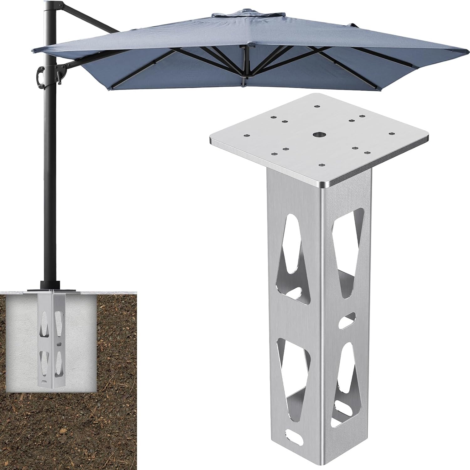 • Robust and Durable: The umbrella holder is made from high-carbon steel with sturdy welds and an electroplated surface, our base offers exceptional durability and corrosion resistance, ensuring a long-lasting, stable foundation. It comes with two 13.8-inch steel tubes for reinforcement, and each side of the base features two triangular-shaped cutouts for a perfect fit with concrete.
