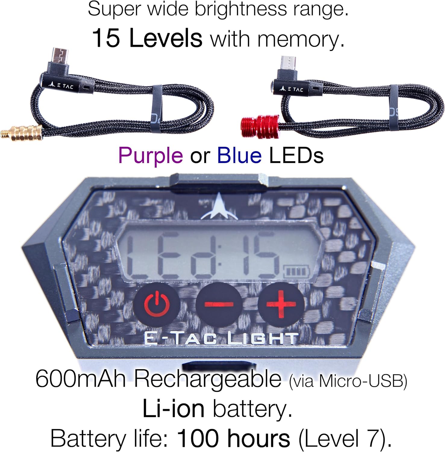 | Included Components | 2 Fast Chargers. Micro-USB Cable. Assorted Screws, Hex Keys., 2 LEDs: 8-32 and 3/8-32 with Your choice of blue or Purple color., 4 adapters: 3/8-32 to 1/4- 28, 3/8-24, 7/16-20, & Fiber., E-Tac Light power unit., Mounting Accessories: 3 CNC T6 Plates, 2 Steel Spacers. |