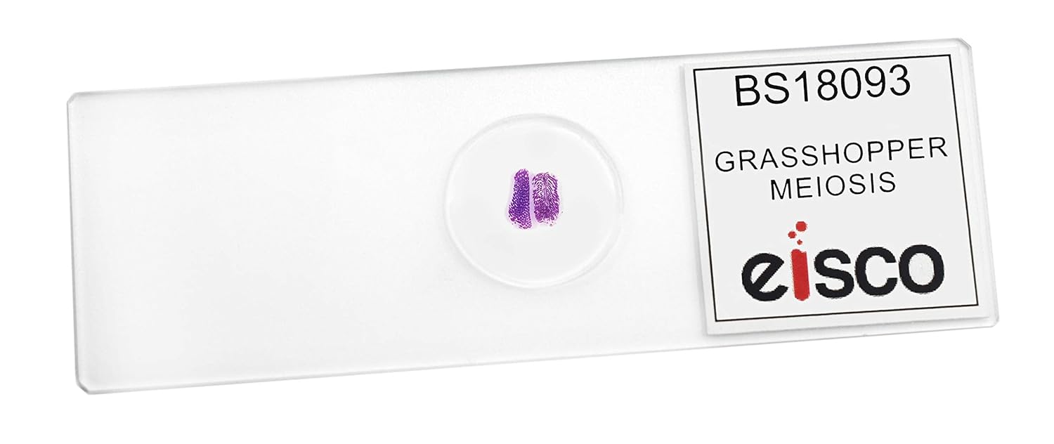 Single, prepared microscope slide of grasshopper meiosis. Ideal for studying cell division. The slide shows cells in all stages of meiotic cell division in grasshopper testis. Useful for exploring structure-function connections as per NGSS standards. Excellent for biology classrooms. Arrives in protective cardboard casing. The slide measures 75mm (3") wide, 25mm (1") long, and 0.06" in height. Slides are expertly prepared and labeled for easy identification. All materials in Eisco Labs slides are completely inert and sealed in glass.