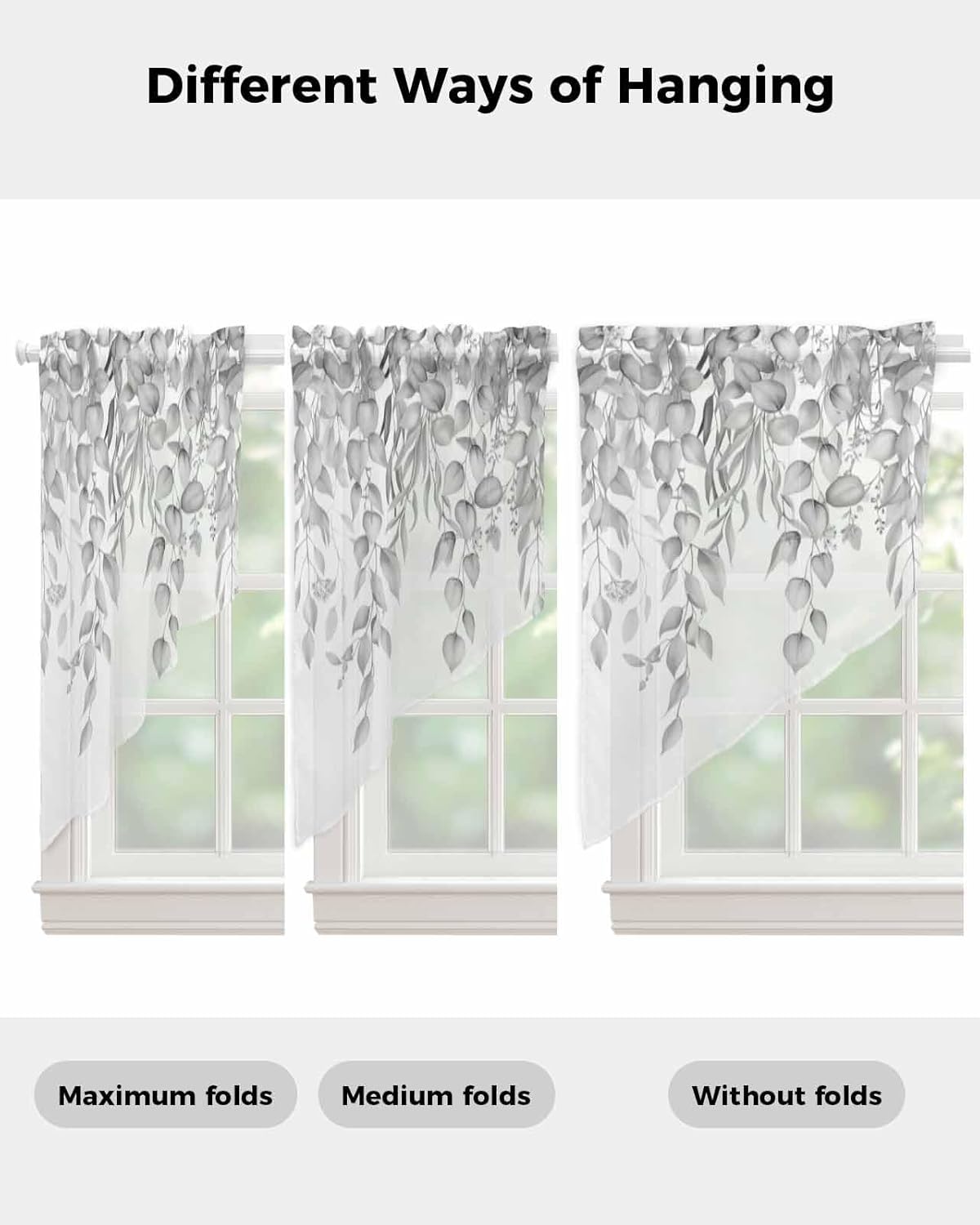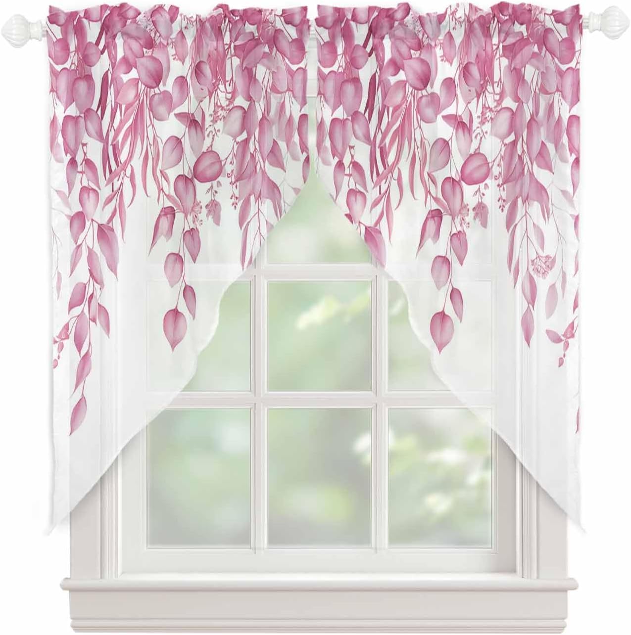 4 Sizes:Bathroom window swag valance curtains short 36 inch length 2 panels set, middle centers size is 18"H, total bathroom sheer curtains swag window small size is 56"Wx36"L(71x194cm)Kitchen curtains 36 inch length 2 panels set, middle centers size is 18"H, total swag sheer valance curtains for living room size is 72"Wx36"L(91x182cm)Cafe curtain 45 inch length 2 panels set, middle centers size is 20"H, total size is 72"Wx45"L(91x230cm)Cafe window swag sheer curtains panels 63 inch length 2 panels set, middle centers size is 20"H, total size is 72"Wx63"L(91x320cm)Pocket size for each country swag curtains for bedroom: 1"+3"This wide pocket measures 3", making window curtain valances swag easy for the curtain rod to fit in and out.There are 1" pleats on the wide pocket, allow the nursery room swag curtains window to hang down with wave amplitude.Diverse Pattern:It is easy to create different room styles with different styles of kitchen curtain tier swag set.If you want to decorate a style that belongs to animal print/cartoon/checkered/floral/leaf/polka dot/striped/rainbow/snowflakes, ect.You can buy our farmhouse kitchen swag curtains with confidence.Perfect Gift:Valance curtain swag window drapery for backdrop/party/café/RV camper/cabin/car/tents/french door are very practical.Whether you want to use bedroom swag curtains to decorate your room or outdoors to create a joyful atmosphere, or to hang swag office window drapery on your window for practicality reasons, valance swag hotel curtains are very suitable.And our drapes and swag valances for living room have a special style, so window drapes valances swag are often given as gifts to family and friends.We can achieve high praise on holidays such as Christmas, Halloween, New Year, Valentine's Day, St. Patrick's Day, Easter, Father's Day, Mother's Day, Independence Day and Thanksgiving, ect.