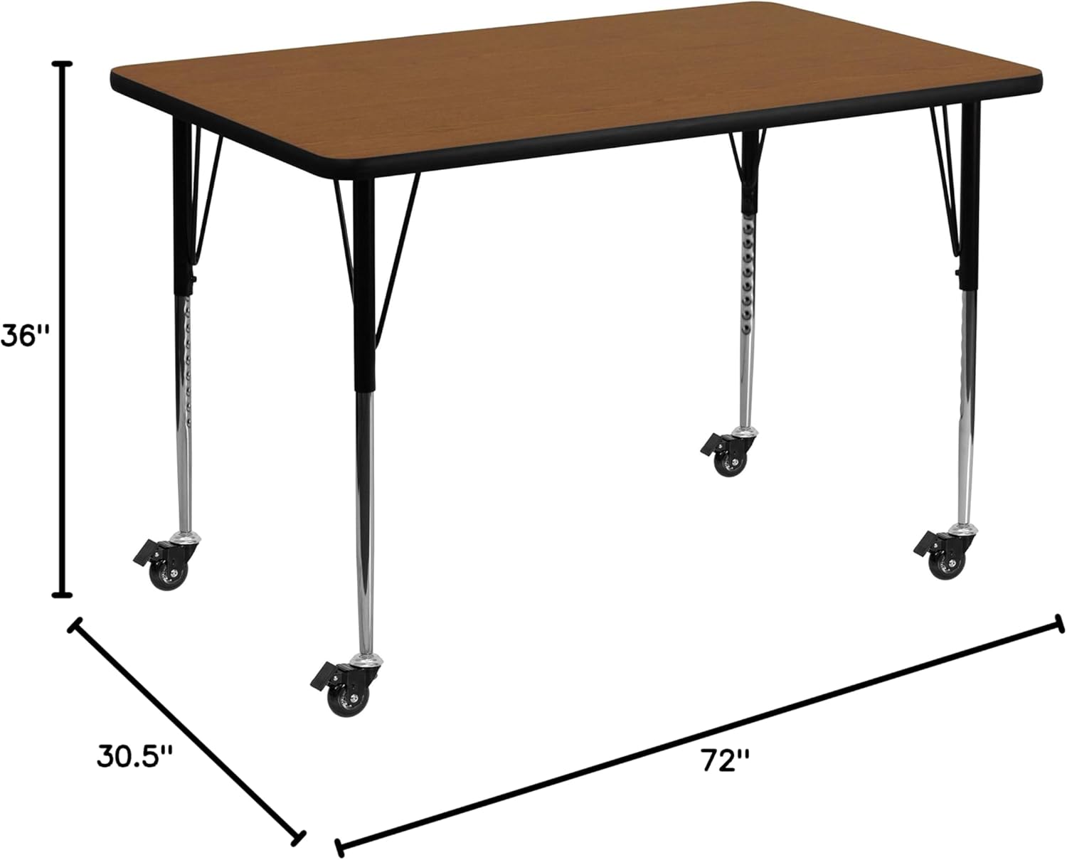 The Rectangular Activity Table is a versatile option for school classrooms, corporate training centers and your home. Enhance collaborative learning by grouping tables together. It will accommodate children of all ages, from 1st grade to adult. It features a 36"W x 72"L high pressure scratch, stain and warp resistant laminate top with a black edge band and 16 gauge tubular steel legs for increased stability. The top incorporates a protective underside backing sheet to prevent moisture absorption and warping. An attractive black powder coated finish protects the upper legs from scratches and height adjustable chrome lower legs give you the flexibility to raise or lower the table a full 9" in 1" increments. Casters allow you to easily move the table around and then lock into place. This activity table provides a durable work surface for anything from computer labs to project meetings to laying out fabric in your sewing room.
