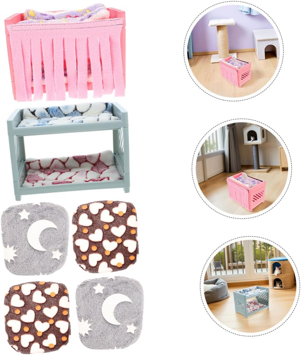 Package List 2 x Hamster Bed 4 x mats 4 x blankets Characteristics -Product Info: Pet bed -Hamster Bed: doublelayer structure offers ample room for pets to climb, hide, and explore, active and healthy behavior hamster house bed -Material:Plastic, cloth -Hamster house: combines rose pink and nordic blue to create a visually appealing pet accessory that complements modern home decor small animal bunk bed -Hamster Bed: ideal for small animals like hamsters and guinea pigs, providing a dedicated space for their daily activities and rest cage accessories -Convenient : features removable and washable components for effortless maintenance, ensuring a and fresh environment for your pets small animal hideout nest -Warm and cozy: comes with soft cushions and blankets to keep pets comfortable and secure, enhancing their sleep and relaxation experience hamster bed -Size:24.00X17.00X15.00cm/9.43X6.68X5.89in -Color:Assorted ColorGoods Informationsmall pet hideout The soft bedding materials keep your pet warm and relaxed, while the layered design promotes natural behaviors like climbing and burrowing.hamster house hideout It's an excellent solution for creating and inviting habitat for your beloved pets.hamster bed with blanket Designed to meet the needs of small animals, this hideout bed offers a blend of comfort and entertainment