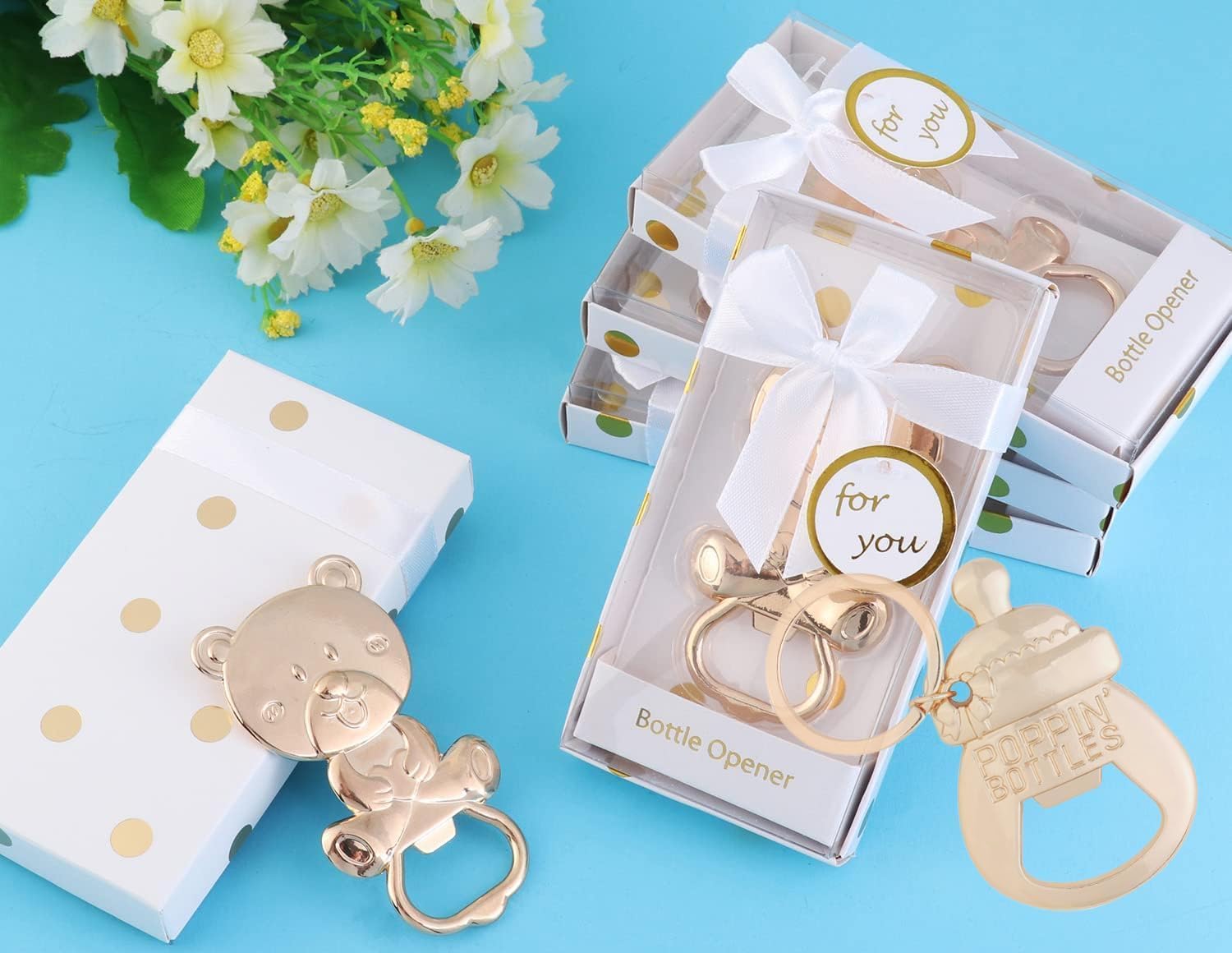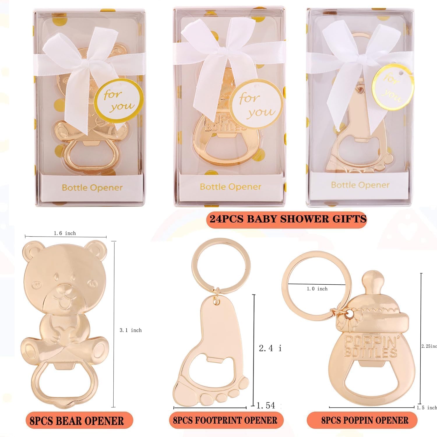 Do you want to prepare an eye-catching and unforgettable baby shower party for your little boy or girl? They will be perfect favors for baby shower party. Bottle Opener for Baby Shower Favor Material: Premium zinc alloy. Bottle Opener Color:Gold Bottle Opener Dimension: 3.1" (L)* 1.6"(W); Package box size: 4.5*2.5*0.9 inch Occasion: Baby shower party, gender reveal party ,baby birthday party,mother-to-be party,wedding party,birthday party and so on Package Included: 24 pieces bottle opener for baby shower favors Details: 1.Baby shower party gift presentation includes colorful base with clear cover, white rope tie and bow, and round,coordinated hang "Thank you"tag.which will be great for a unique gift that will make your family and friends surprised for a long time 2.Look no further than our Bear Shaped Bottle Opener. Made from durable gold-tone metal,These unique bottle openers are sure to be a hit with guests and a favor favorite. Features: Easy to use Creative and interesting design Excellent workmanship, Exquisite packaging Well-made, feel good in your hand, perfect size and design. Unique, and beautiful, they will definitely surprise your friends and guests.