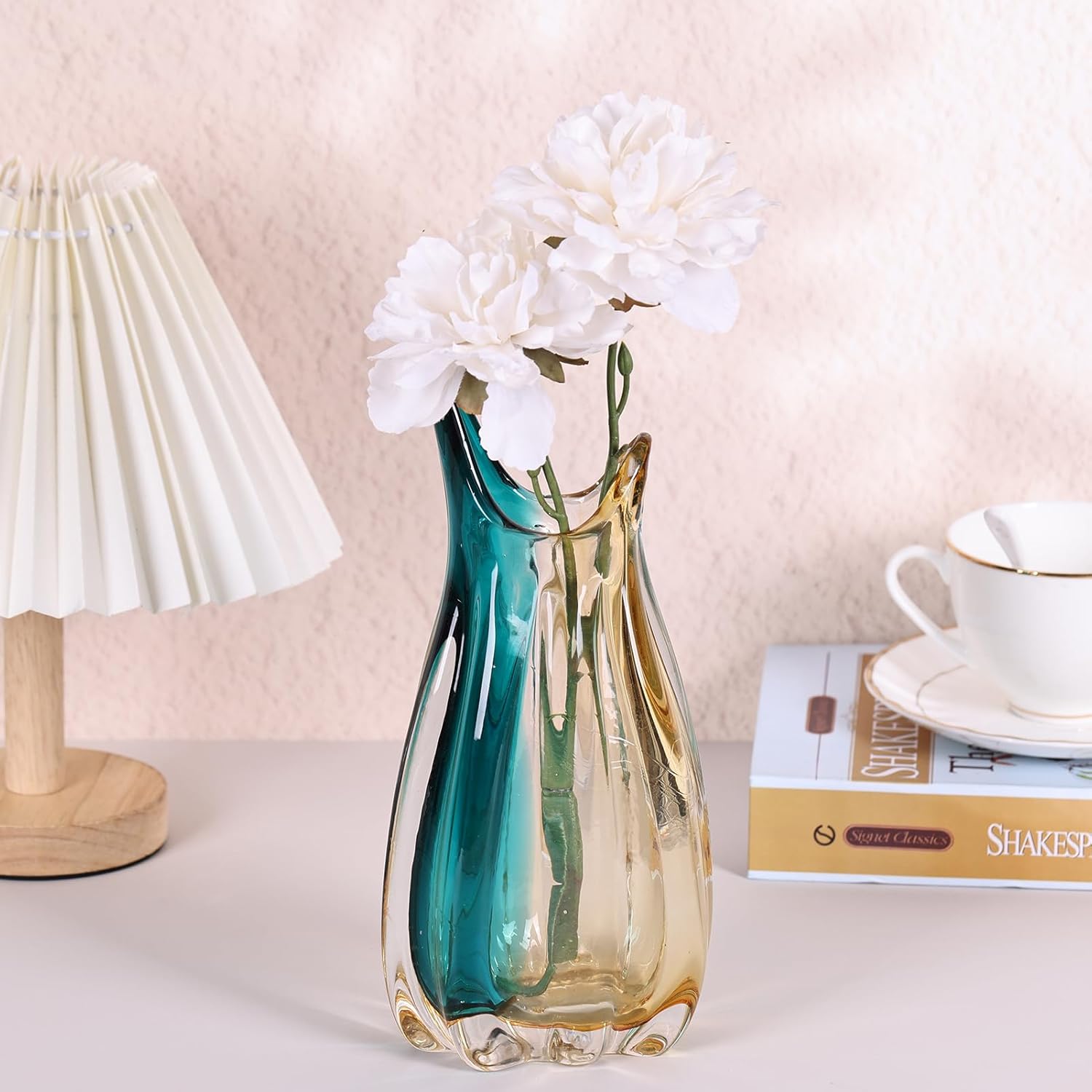 Modern Home Decor Centerpiece - Artisan Hand-Blown Gradient Glass Vase - Ocean Teal to Amber Sunset Breathe new life into your space with a play of light and color. This set of artisan blown glass vases is more than a container for flowers; it's a captivating piece of long-lasting decor that transforms any room into a gallery of light Each vase is a testament to the glassblower's art. Shaped by breath and skilled hands, the glass takes on a fluid, organic form that is entirely unique. This handmade vase collection celebrates slight variations in form and thickness, making each piece a signed original for your home The true magic lies in the stunning color gradient. Each vase transitions seamlessly from a vibrant, oceanic teal at its widest point to a warm, sunset amber at its stable base. When sunlight filters through, the vase becomes a luminous centerpiece, casting ethereal, colored shadows and creating a dynamic modern vase that changes with the day Crafted from sturdy, high-quality glass (each weighs 2.6-2.7 lbs), these vases feature a substantial feel that lends a luxurious stability. Their robust construction makes them suitable for both indoor and sheltered outdoor use. Style them as a pair on a living room mantel, separately as bedside decor, or together on a dining table for an instant colorful centerpiece More than just vases, they are an experience. They are a perfect unique gift for a housewarming, a thoughtful wedding gift for new beginnings, or a beautiful upgrade to your own sanctuary. Let these hand blown glass vases be the conversation-starting art that holds your favorite blooms.