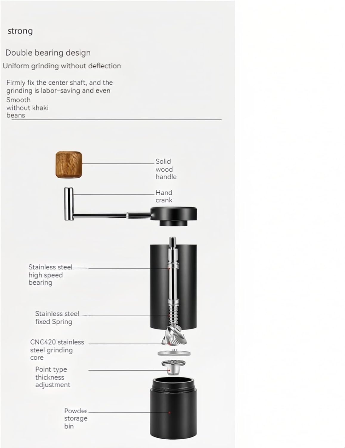 Thousand yuan bean grinder configuration, comfortable typing and grinding feel, using CNC machining. Cutting is fast, firm, labor-saving, smooth, and grinding is stable without jamming. Double bearing fixation, high concentricity, and uniform grinding Point based numbers and number memory point pairs can be easily adjusted to meet various grinding requirements of different thicknesses. By using adjustment nuts, you can easily grind the desired roughness from fine to coarse. Rotate clockwise to obtain finer powder; Rotate counterclockwise to obtain rougher powder Excellent precision steel grinding core: using sharp blades for precise CNC cutting, it can quickly and evenly cut beans, achieving almost no coarse particles for uniform grinding. All metal integrated space aluminum body, compact and convenient in size, stable in grip, comfortable to grip