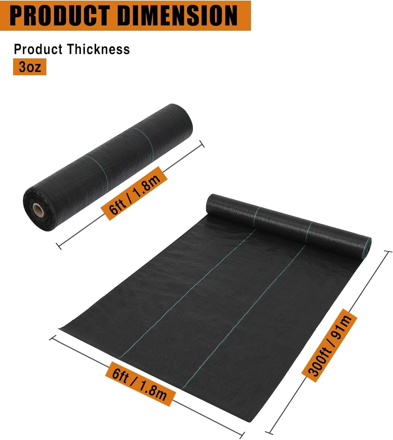 Feature:Landscaping fabric allows water and air to pass through easily, promoting healthy root growth.Weed barrier fabric is strong and durable, making it ideal for harsh environments.Garden cloth is designed to withstand harsh weather conditions.Woven geotextiles are lightweight, easy to cut, and easy to install.The product is versatile and available in eight sizes to suit your needs.Specification:Colour: BlackMaterial: Velvet PP materialDimensions: 5oz 4ft x 50ft 5oz 4ft x 100ft 5oz 4ft x 250ft 5oz 4ft x 300ft 3oz 6ft x 300ftNote:1. Due to manual measurement, please allow 1-3cm error. Make sure you don't mind before bidding.2. Due to the difference of different monitors, the picture may not reflect the actual color of the product. Thanks.