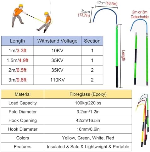 Introducing our High Voltage Insulating Poles, an essential safety tool designed to protect you and your loved ones from electrocution hazards in daily life. Whether for professional use or home safety, these poles are a must-have for anyone working with or around electricity. Crafted from high-quality fiberglass (epoxy), our insulating poles are lightweight yet incredibly sturdy, with a load capacity of up to 220 lbs. Available in vibrant colors—yellow, green, white, and red—these poles are designed for visibility and safety. With diameters of 3.2 cm (1.2 in) and hook openings measuring 42 cm (16.5 in), our poles ensure a secure grip and easy handling. Choose the perfect length for your needs, ranging from 100 cm (0.3 ft) to 300 cm (9.8 ft), with voltage withstand capabilities from 10 kV to an impressive 110 kV. This versatility makes them ideal for a variety of applications, including auto maintenance, electrical work, and industrial settings. Safety is paramount, which is why our poles feature a non-slip grip for comfortable operation and a reinforced insulated handle for added protection. The durable alloy hook, coated with a plastic insulating layer, ensures safety and longevity while preventing deformation even under heavy use. In emergency situations, having a high voltage insulating pole on hand can make all the difference. Equip your workplace or home with this essential tool to enhance safety for yourself and your employees. Please remember to wear insulated gloves while using the pole for optimal protection. Minor size variations may occur due to production processes, and color discrepancies may arise from lighting conditions. Make safety a priority—add our High Voltage Insulating Poles to your toolkit today!