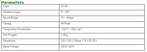 Huanyu /b> Product Description The rotary mixing solution YC-80 is mainly used for tissue culture, sample extraction, sedimentation rate determination. E.g. blood sample mixing, wet-chemical analysis of radio-immunity, glucose, protein, DNA, cellula, urine, enzyme, etc. It also widespread applied in biochemistry, organism, cellula, immune, chemistry, flora and fauna analysis, clinical experiments, etc. It is capable of long-time continuously uniform working, and is very convenient to operate. Gradient of the turntable is changed freely. It can also working in the thermostat incubator. Technical Datas?/b> Type:YC-80 Gradient Range:0?90? Speed Range:10 ?0rpm Timing:9999min Temperature Restriction:?65??Dry Air? Net Weight:4.5Kg Dimension:220 x 236 x 246mm?W x D x H? Input Voltage:AC85~265V