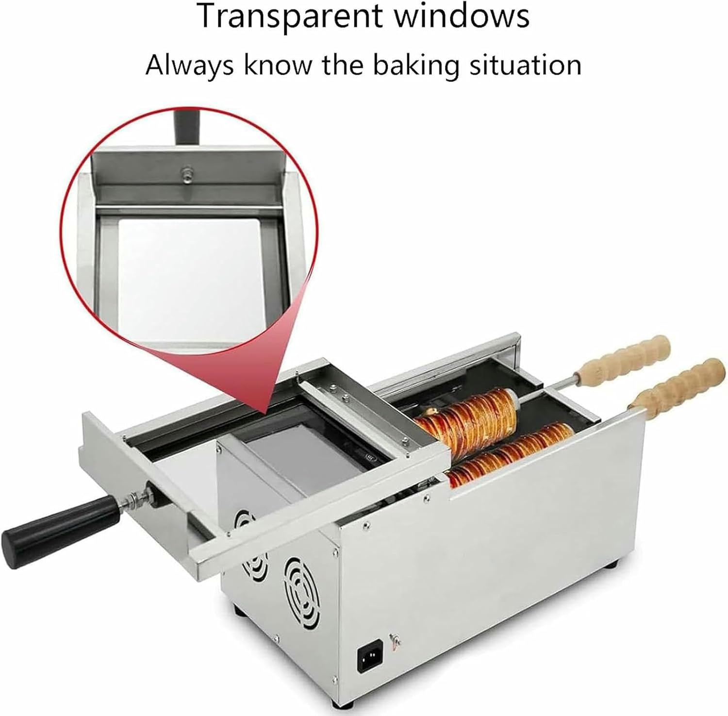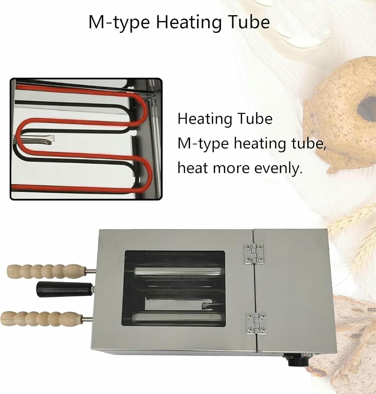 The Chimney Cake Roll Oven Maker is designed to address various baking needs efficiently. Here’s how it assists users: 1. **Efficient Production for Commercial Needs**: This oven can bake 2 loaves simultaneously, enhancing production capabilities and catering to the demands of commercial establishments for bulk baking. 2. **Convenient Operations with Flexibility**: This versatile machine not only specializes in making chimney cakes but can also be adapted for other baked goods like donuts, minimizing equipment costs and conserving kitchen space. 3. **Durability and Safety Features**: Made with smooth stainless steel surfaces that resist dirt accumulation, it includes a transparent skylight for easy monitoring of the baking process, helping to prevent burning and over-processing, thus reducing waste. 4. **Versatile for Various Environments**: Whether in a commercial setting such as snack bars and restaurants or for home use, this oven offers stability and efficiency, perfect for making satisfying breakfasts or delightful desserts. The uniform heating and precise temperature control ensure that the baked products are crispy on the outside and soft on the inside, enhancing both taste and presentation. 5. **Cost-Efficiency and Space Optimization**: The compact design allows for efficient use of counter space, making it ideal for small shops or home kitchens. Additionally, its durable materials contribute to lower maintenance needs and reduced long-term operational costs. Whether you are a commercial user aiming to enhance efficiency or a home baker seeking a range of baking options, this machine provides effective solutions.
