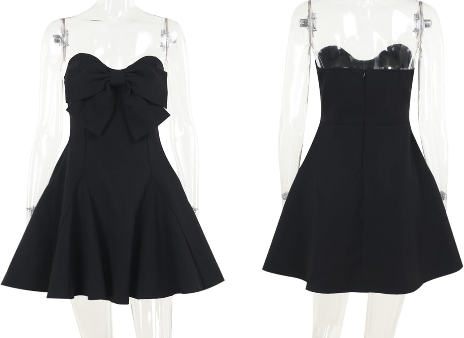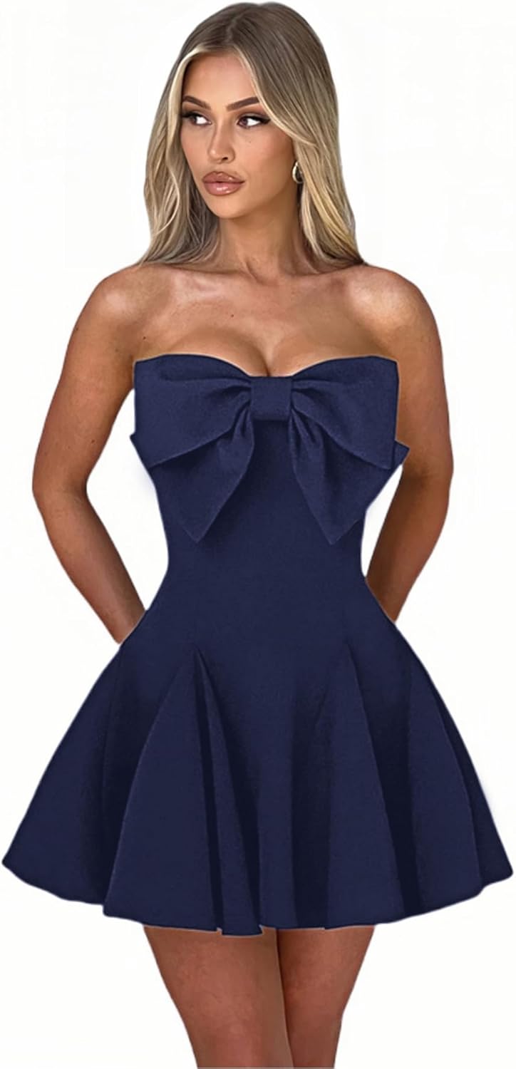 JUMISEE Women's Elegant Strapless Homecoming Dress with Bow Sexy A Line Swing Tube Mini Dress Short Evening Gown Prom DressSize Details:X-Small ----- length: 22.63’’, bust: 27.55’’ – 32.28’’, waist: 25.98’’Small ----- length: 23.22’’, bust: 32.67’’ – 34.25’’, waist: 27.55’’Medium ----- length: 23.81’’, bust: 30.7’’ – 35.43’’, waist: 29.13’’Large ----- length: 24.4’’, bust: 33.07’’ – 37.79’’, waist: 31.49’’X-Large ----- length: 25’’, bust: 35.43’’ – 40.15’’, waist: 33.85’’Features:1) Back zipper closure design, it’s convenient to put on and off.2) Made of textured polyester fabric that is soft, breathable, skin-friendly and comfortable to wear.3) The non-slip silicone at the top keeps the dress in place and prevents it from slipping off.4) The swing hemline is to emphasize your curves for a captivating look.5) The slim-fit and a-line design makes the dress perfectly fits on your body to create a slim hourglass silhouette.6) This fashionable homecoming dress with a pretty bow on the front makes the dresses elegant to wear.6) Perfect for cocktail party, homecoming party, Christmas banquet, New Year eve, evening party, birthday party, prom, ball, bridal shower, graduation party, wedding party, dinner party, etc.Notes:1) Please confirm the size carefully before ordering.2) Please allow slight dimension difference due to different manual measurement.3) The color maybe a little difference compare the image with actual item due to monitor reflect.4) If any question, leave us a message, we will keep in touch with you.