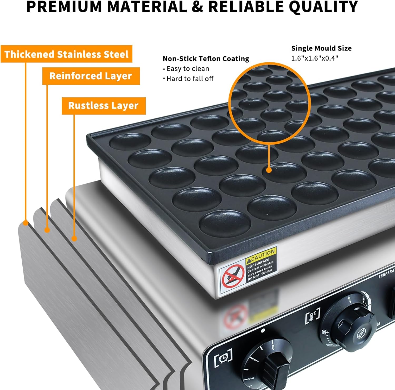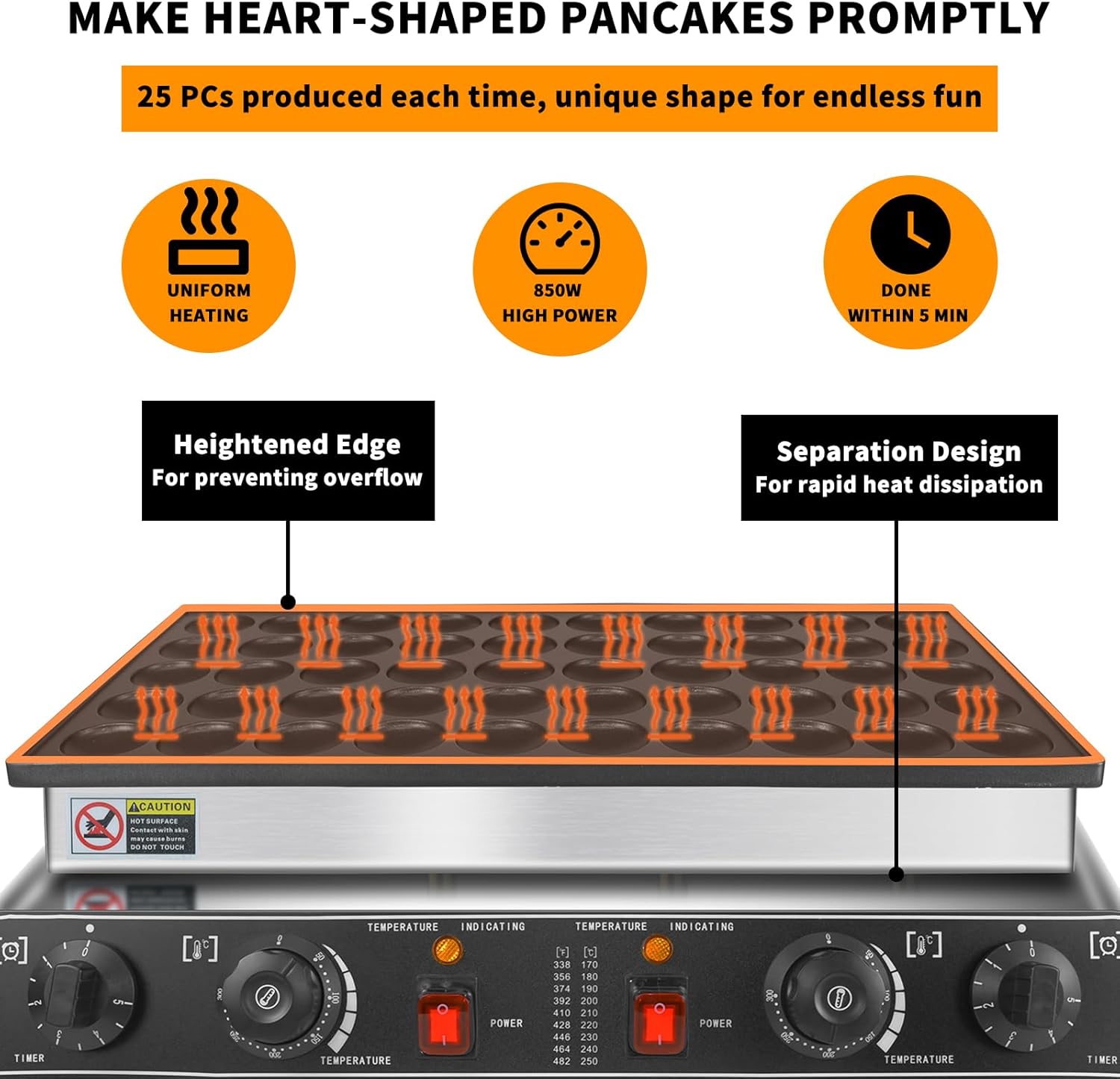 This commercial pancake maker is made of high quality food grade stainless steel body and non-stick cast aluminum plate material, with large baking area, only 50 Mini Dutch Pancake Baker can be baked at a time, which is perfect for both home and commercial use! The commercial large waffle Maker is equipped with two thermostats and 5-minute timer settings for individual control of different zones, with a temperature range of 50-300°C (122-572°F),This waffle machine is easy to operate, start the machine with the on/off switch, adjust the desired heat level with the temperature knob and set the cooking time with the timer knob. Flip the pancakes and bake on both sides.3-5 minutes later, a fresh batch of pancakes is ready to be served. ·Heavy-Duty Material·High Efficiency·Precise Temp & Time Control·Easy CleaningSpecificationsPower: 1.7kWHeating Area: 19.5"x10.2" (495x260mm)Single Pancake Size: φ1.8"x0.4" (φ45x10mm)Temperature Range: 50-300℃ (122-572℉)Product Dimensions: 21.0"x12.0"x8.0" (533x305x203 mm)Product Weight: 19.8 lbs (9 kg)Our electric nonstick round waffle machine makes waffles for breakfast, snacks between meals or dessert. You can also customize them by adding melted chocolate, fruit, ice cream or other toppings, which are widely used in restaurants, family dinners, bakeries, buffets, street food stores, coffee shops and more!If there is any problem, please contact us, we will help you solve the problem at the first time!