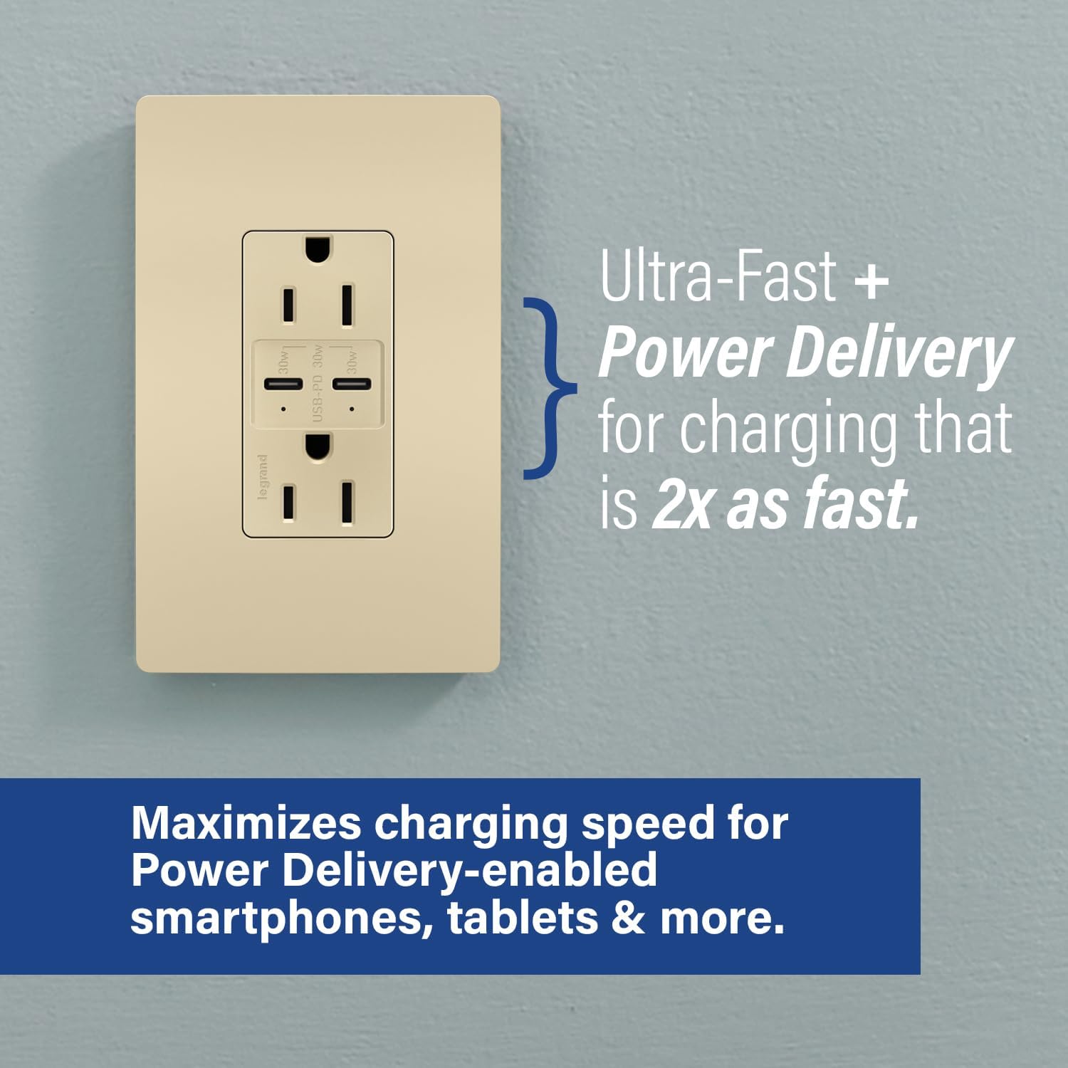 Charge devices up to 2X faster with the Ultra-Fast PLUS Power Delivery USB Outlet. Made to deliver a leading 30 Watts of power and featuring two built-in Type-C USB connections, this solution adds advanced Power Delivery to the industry-leading amperage of our Ultra-Fast line. The result is a faster, future-proof option for convenient in-wall charging, specially designed to optimize performance for your Power Delivery-enabled devices. Easily replace a traditional outlet in as little as ten minutes to gain the modern functionality of intelligent charging for maximized speeds, complete with multi-layered overcurrent protection to keep the outlet and your devices safe from damage. Wall Plate sold separately. Made exclusively for use with screwless Wall Plates from the radiant® Collection.