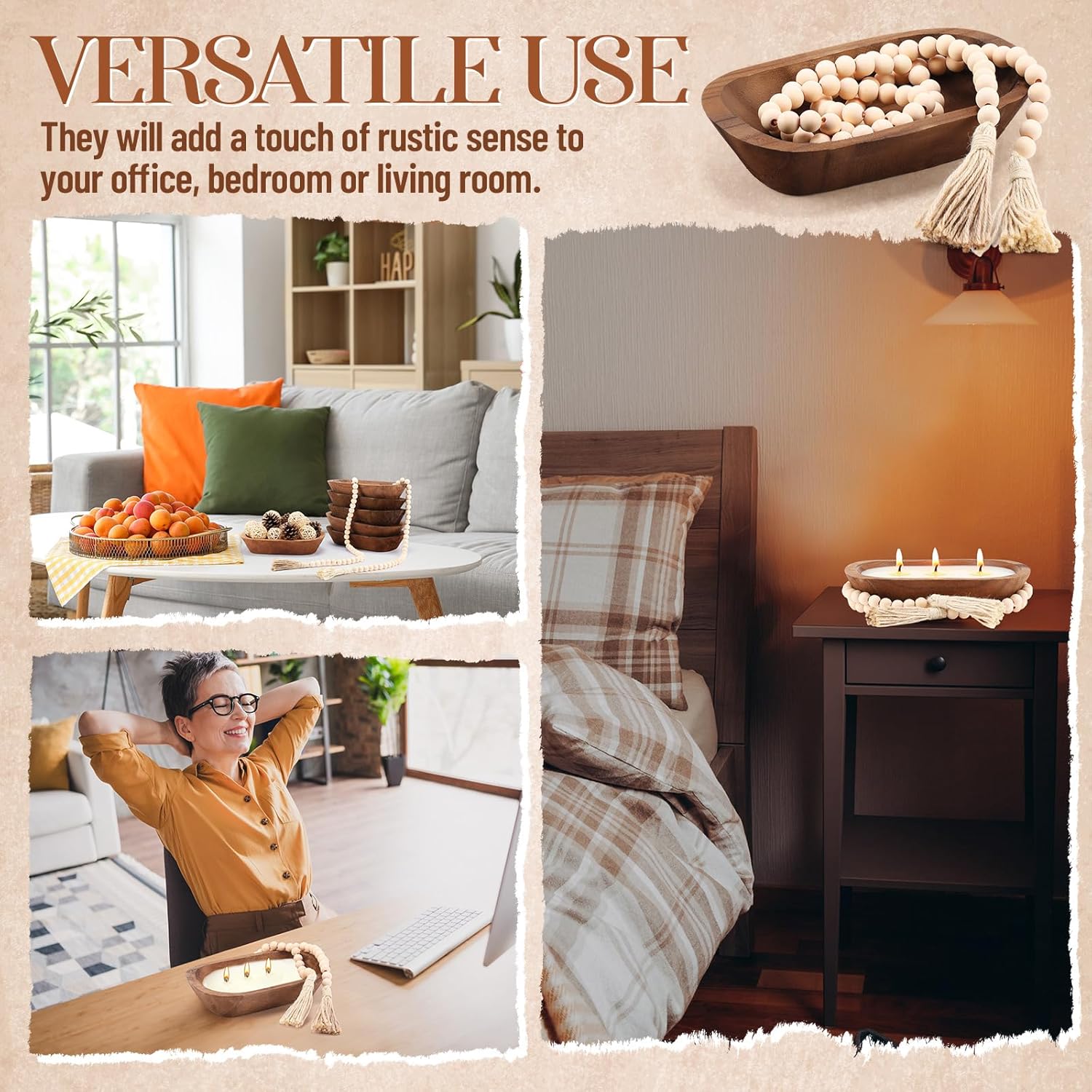Features: Hand-Carved Uniqueness Each wooden dough bowl in the set is individually hand-carved, so no two are exactly alike. This artisanal touch makes every bowl a one-of-a-kind piece, adding character and authenticity to your home decor. Ideal for Seasonal Styling Whether it's fall leaves and pumpkins, winter pinecones and candles, or spring florals and Easter eggs, these bowls and bead garlands are the ideal base for year-round seasonal decorations. Product information: Number of Items: 12 PCS Material: wooden Style: Rustic, Bohemian Color: Dark brown Package includes: 6x Wooden Dough Bowl Size: 9.06 x 5.51 x 1.57 inch 6x Beads String with Tassel Size: 16MM, 84 Beads Notes: Manual measurement may result in slight discrepancies in size