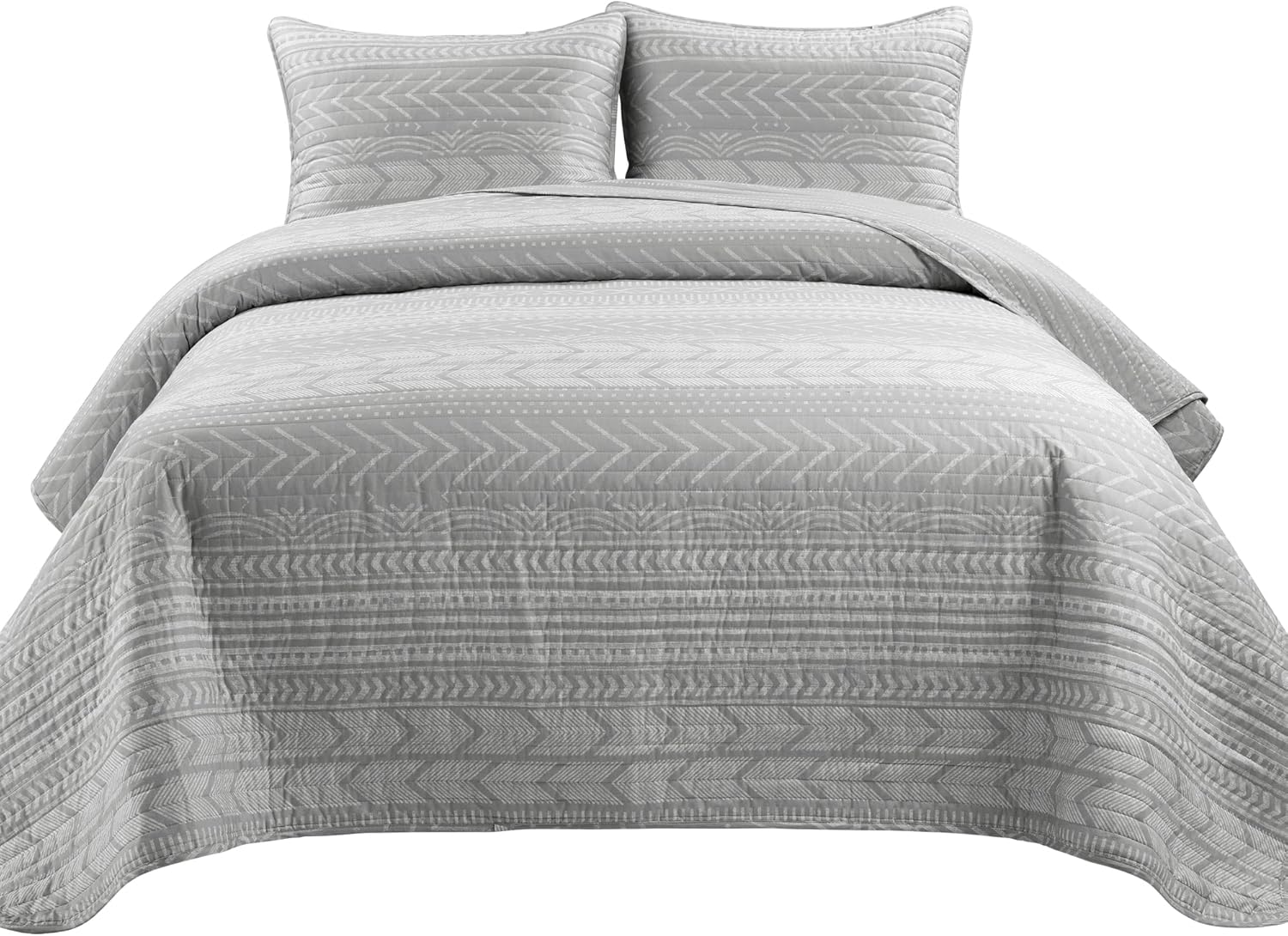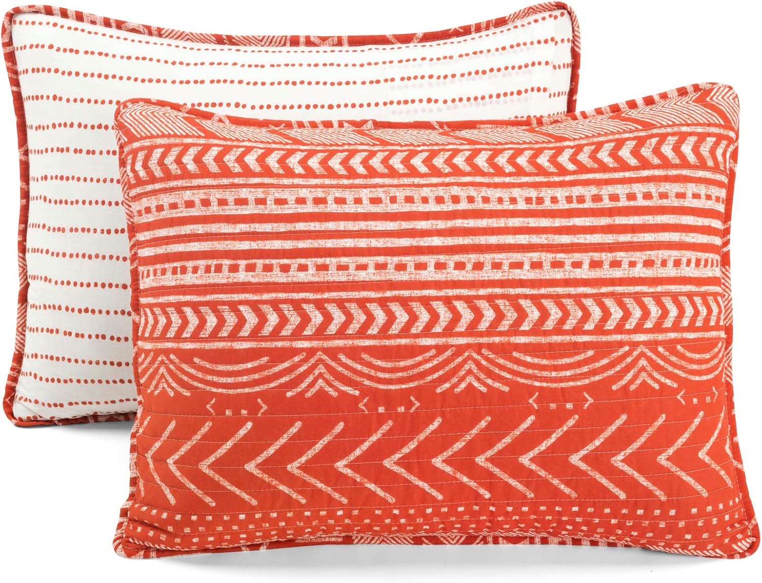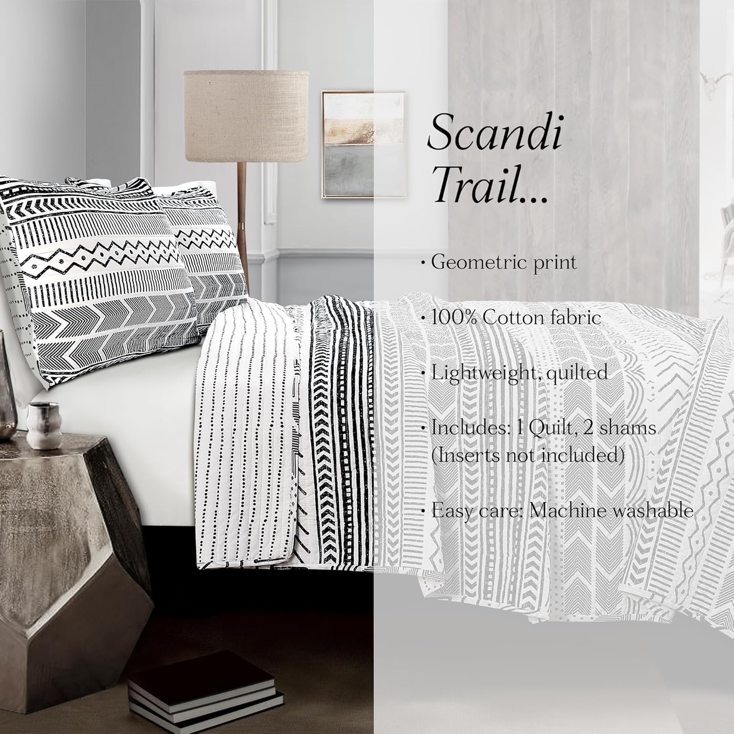 Add subtle depth to your home decor with the Hygge Geo Quilt. This striped bedding set features rows of various geometric shapes and patterns, embracing the Scandinavian decor style. This geometric king quilt bed set has a reversible design, giving you 2 looks in 1. The back features a simple dotted stripe pattern. This reversible quilt set is crafted from 100% cotton fabric. The cotton/poly blend filling is perfect for hot sleepers and great as an extra layer for those cold sleepers who layer-up to keep warm. This king sized 3 piece reversible bedding set includes 1 quilt 108" W x 92" L, and 2 standard pillow shams 36" W x 20" L. The geometric print adds lovely dimension, soft fabric, and 2 distinct patterns. Easy care machine washable.