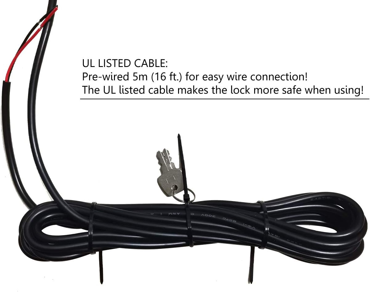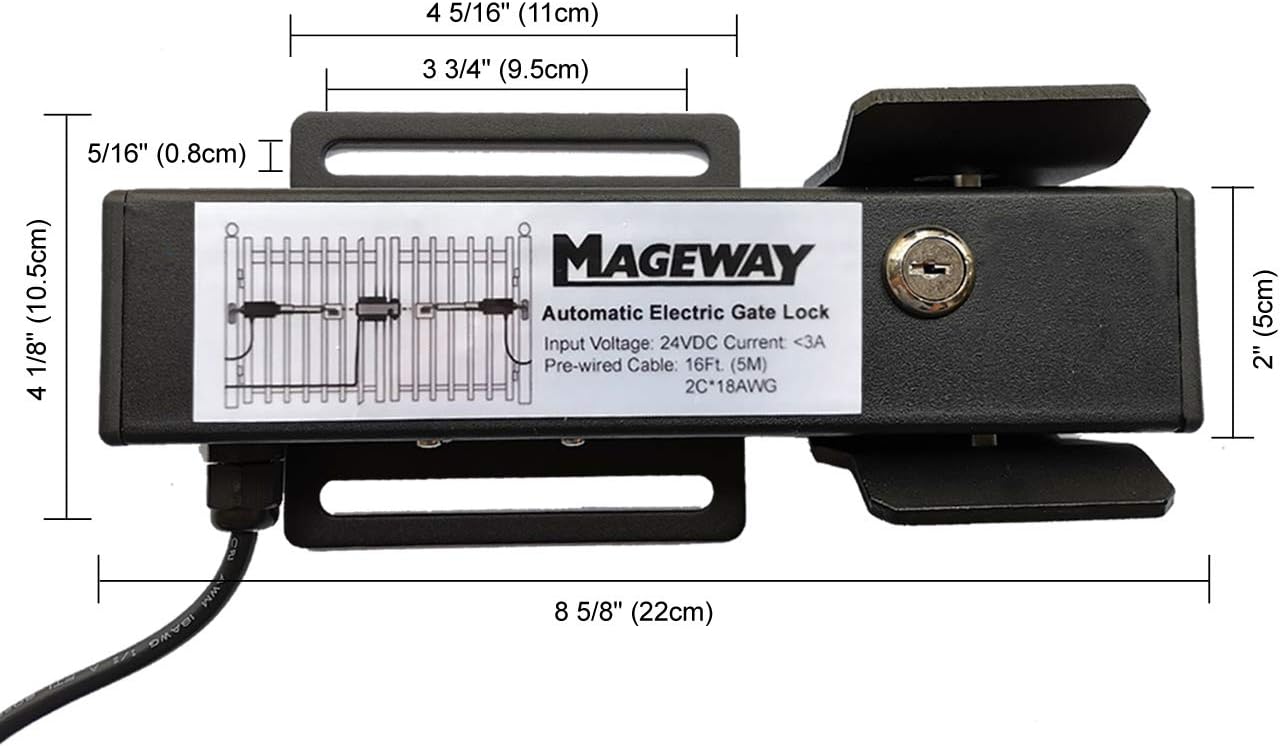 1.Product Description: The Automatic gate lock can locks and unlocks the gate when the Automatic Gate Opener is activated. It is the perfect solution for your gate security upgrade needs. It's also an ideal accessory for your gate opener in a windy area to seure your gate in closed position. It can be compatible with almost all 24VDC automatic gate openers. It can be installed to the gate opener system quickly and easily. It eliminates "wiggle room" between your gate/fence or gate/gate (in dual gate applications). It comes with a keyed manual release in case of power failure! The pre-wired 5m (16 ft.) UL listed 2-core cable provides easy wire connection and more safety when using! Please do not hesitate to email us for a wiring diagram when you can not figure it out how to connect the lock to you opener! 2.Specifications: Holding force: 2200lbs(1000kgs) Input Voltage: 24VDC Current: <2.5A Pre-wired 2-core cable: 5m (16 ft.), 2*18AWG Working temperature: -20 to 55 Celsius degree(-4 to 122 Fahrenheit degree) Humidity: 0 to 95% Working mode: fail-secure; power-on to unlock, power-off to lock