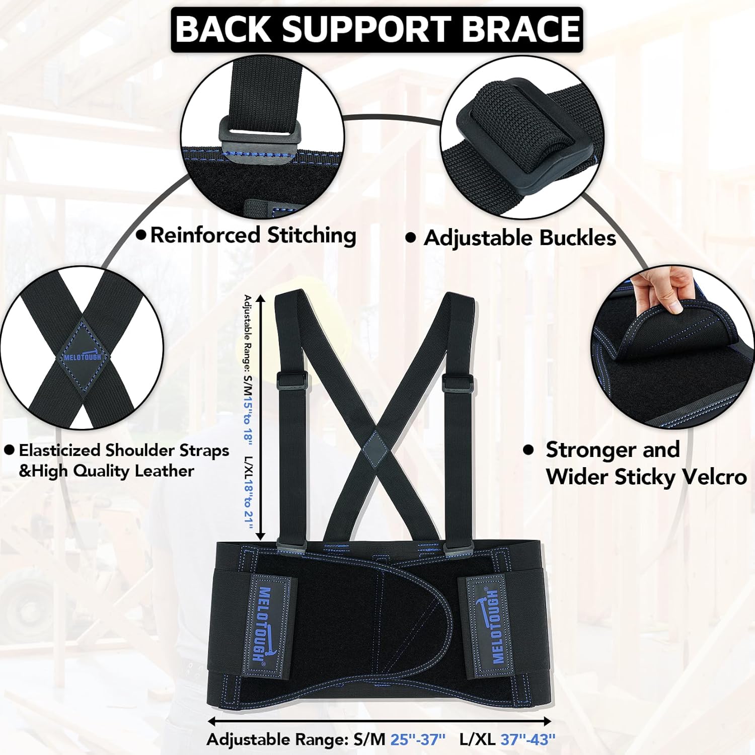 MELOTOUGH Back Support Belt with Suspenders,Heavy Duty Work Back Brace for Men & Women,Lower Lumbar Support for Heavy Lifting, Removeable Straps,Industrial Lower Back Pain Protection Belt for Construction, Warehouse, Moving & Physical Labor Safety ;MELOTOUGH Hammer Holder for Belt,Hammer Loop Fit Up to 2" Tool Belt,Holds Hammers,Hatchet or Mallet,Made of Aluminum Alloy Material (Black)