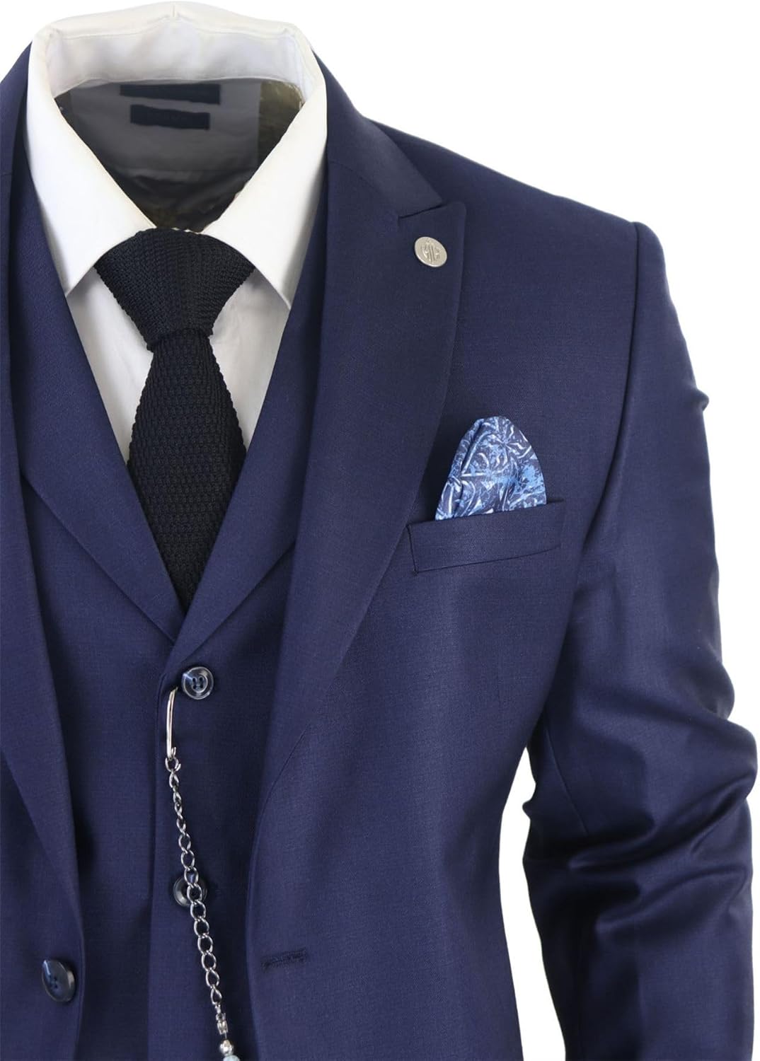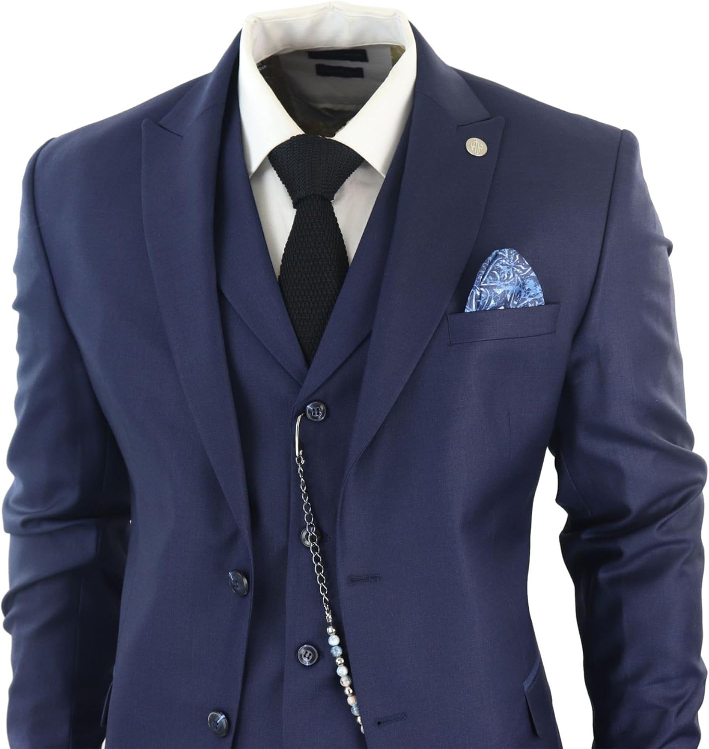 Classic and Elegant Design: This men's 3-piece suit features a timeless navy blue color with contrasting pocket trims and a sophisticated textured pattern fabric, making it perfect for formal occasions. Versatile Formal Attire: Whether it's a wedding, business event, or special occasion, this suit is a versatile choice that ensures you look sharp and well-dressed. Complete 3-Piece Set: The suit includes a jacket, vest, trousers and pocket chain, providing a complete outfit for a polished and coordinated look. Premium Material: Crafted from high-quality materials, this suit is comfortable to wear and designed to last, ensuring both style and durability. Tailored Fit: The suit offers a tailored fit that complements your body shape, enhancing your overall appearance and confidence. Material : 65% Polyester 32% Viscose 3% Lycra
