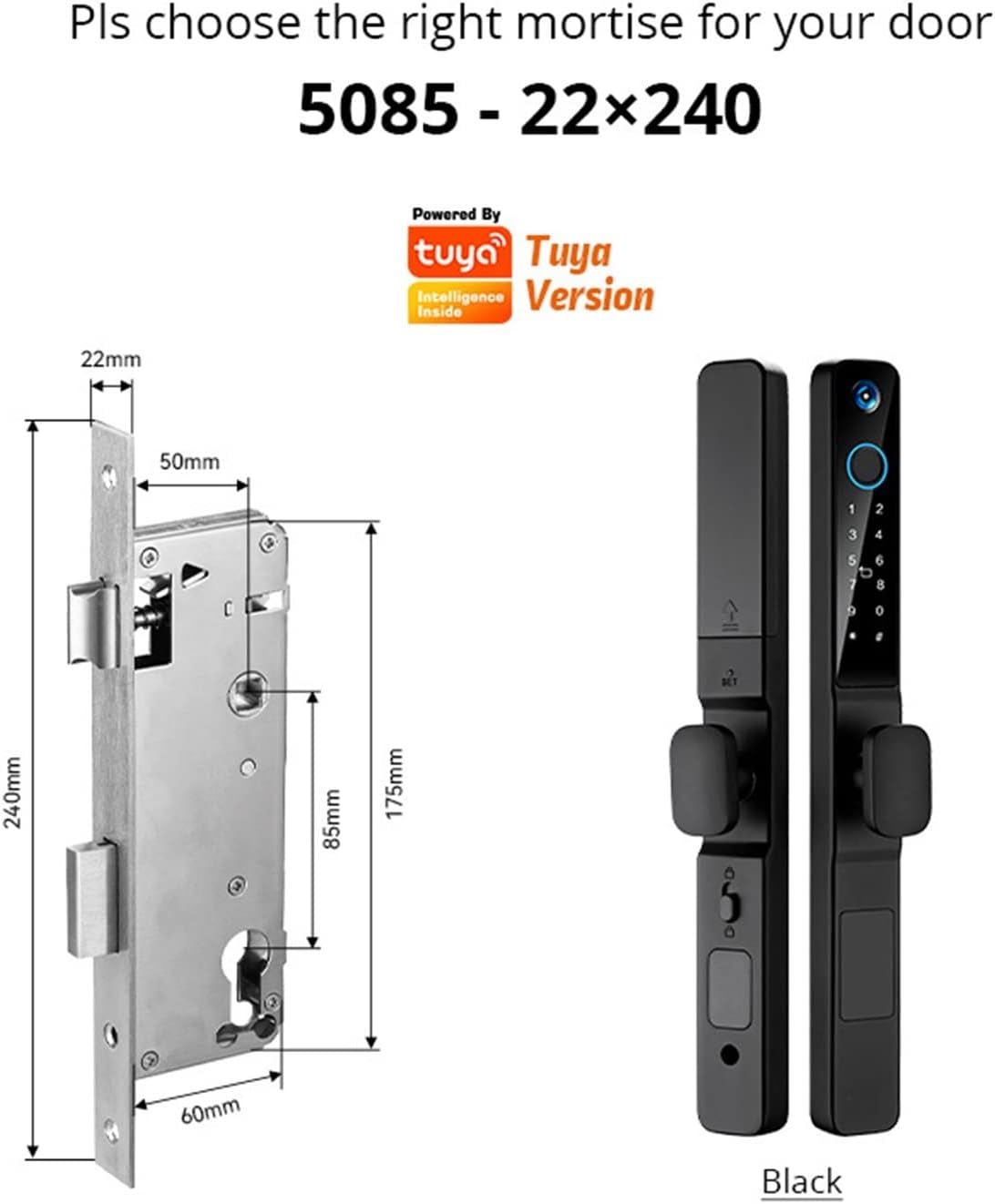 System: Tuya appFingerprint read: FPC Sensor (Semiconductor Sensor)Color: Black / SilverCard User: 300Chip Type: Dual Core DriverRead time: 0.3secondsTouch screen: IML MaterialWorking power: 4 x AAA 1.5V batteries (not include)Operating temperature: -50 to 55 CentigradePassword function: support virtual passwordUnlock mode: APP / Fingerprint / Password / Smart card / Keyfront panel x 1back panel x 1Mortise x 1Lock cylinder x 1Smart card (IC card): x 2Mechanical wrench x 2Screw kit x 1Dear buyer friend, hello. Welcome to my door lock store. Feel free to contact me if you have any questions. Wishing you a pleasant shopping experience and a happy day