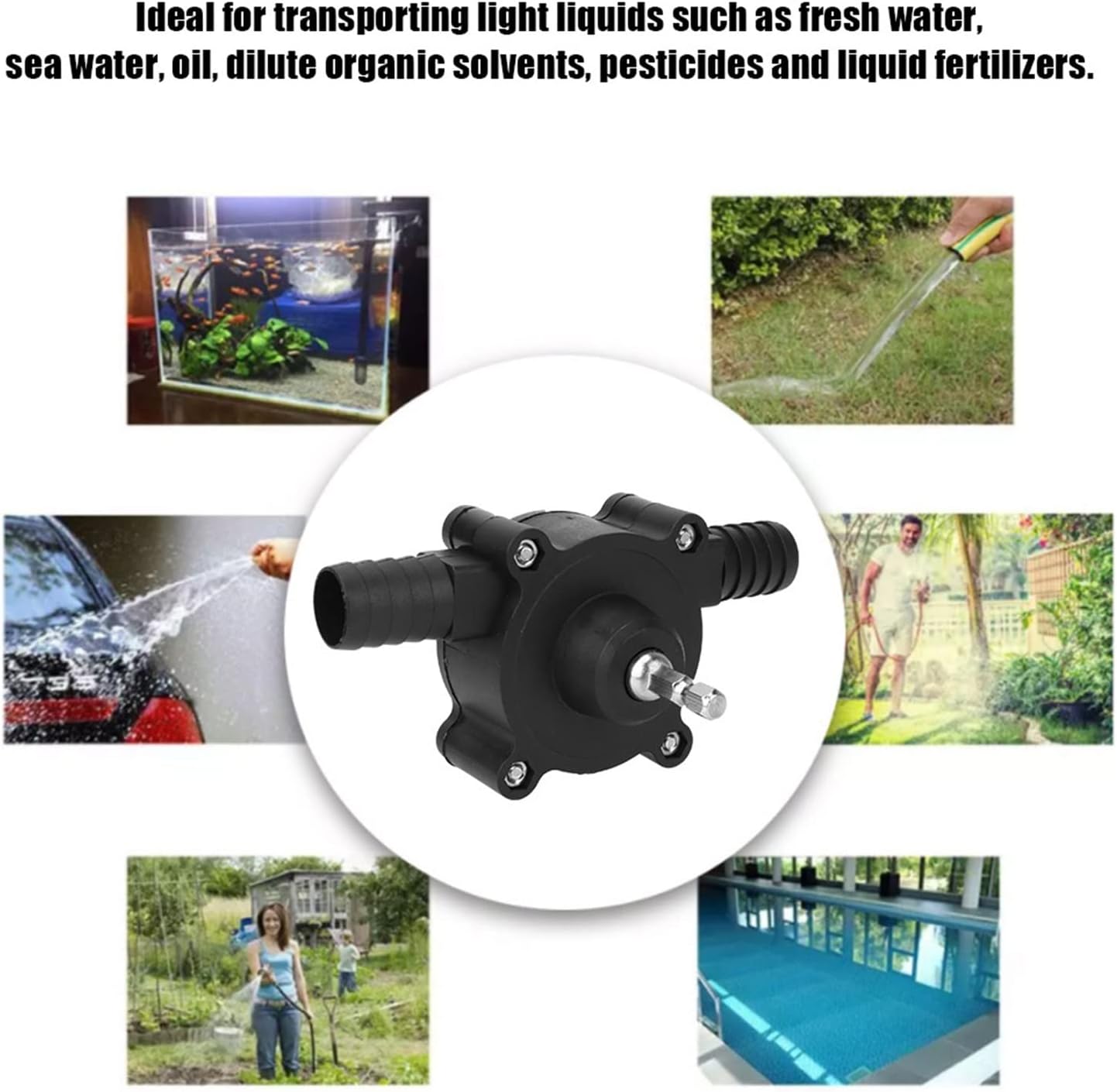 1. Tool-free disassembly and cleaning: Flexible structural design, easy to disassemble and clean without any tools.2. Easy to carry and use: This pump is small in size and equipped with a handle, which is very convenient to carry, so it can be used in small spaces. Suitable for swimming pools, ponds, gardens, basements, aquariums, irrigation and other places.Specifications:Color: BlackPump handle: Hexagonal handleWater flow speed: 1.2 (cubic meters/hour)Inlet/outlet inner diameter: 16mmOuter/inlet outer diameter: 19mm (suitable for 6 pipes)