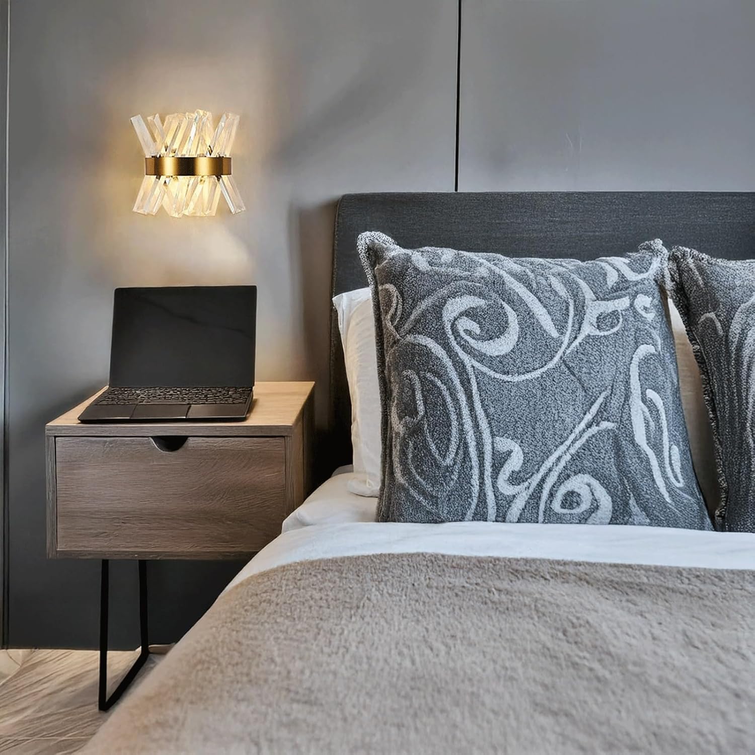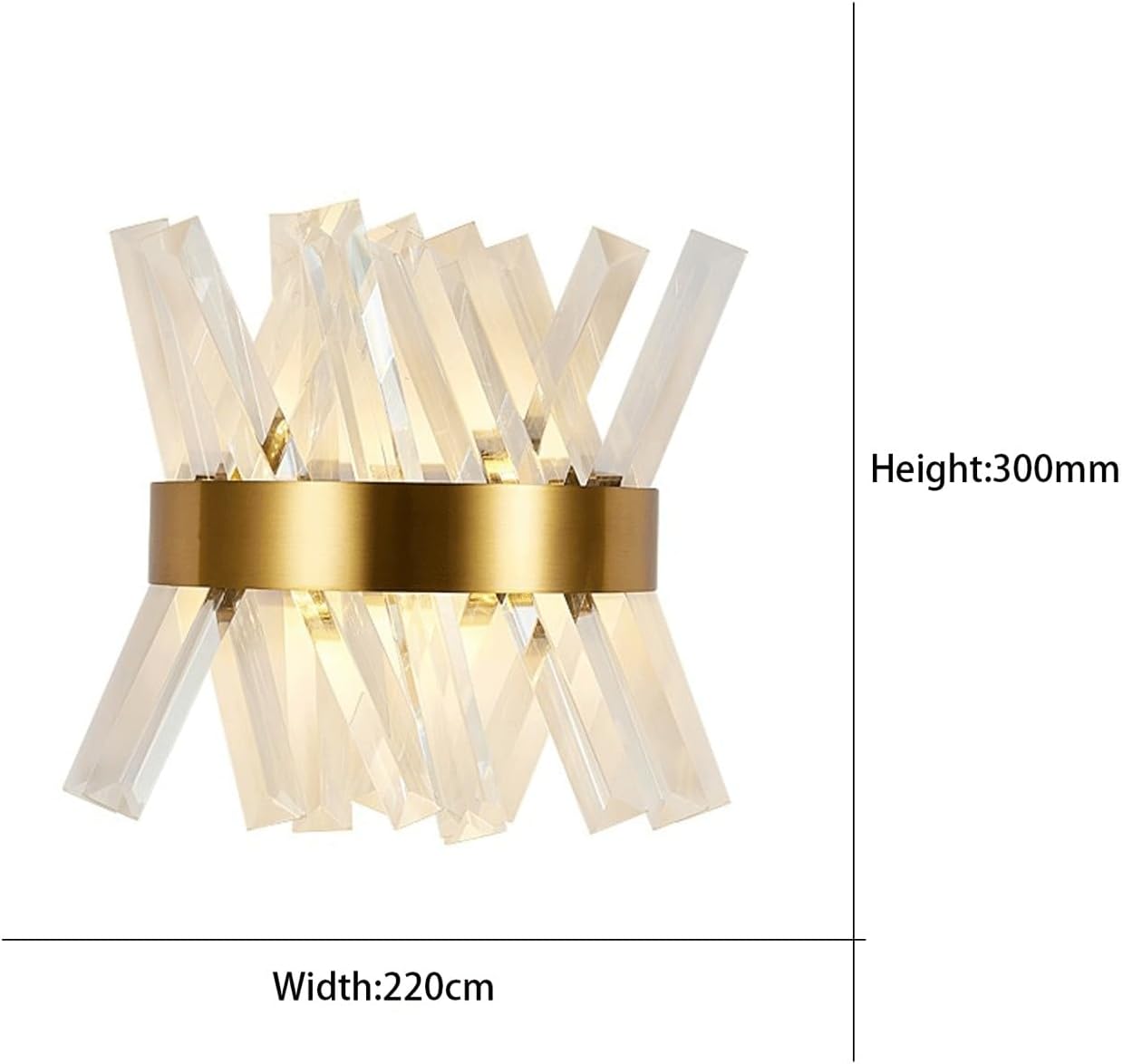 • Luxurious Modern Gold Band & Criss-Cross Crystal Wall Sconce: This captivating wall lamp features a central gold-finished stainless steel band encircled by multiple bright, faceted crystal strips, artfully arranged in a dynamic criss-cross pattern, exuding a unique modern glam aesthetic.