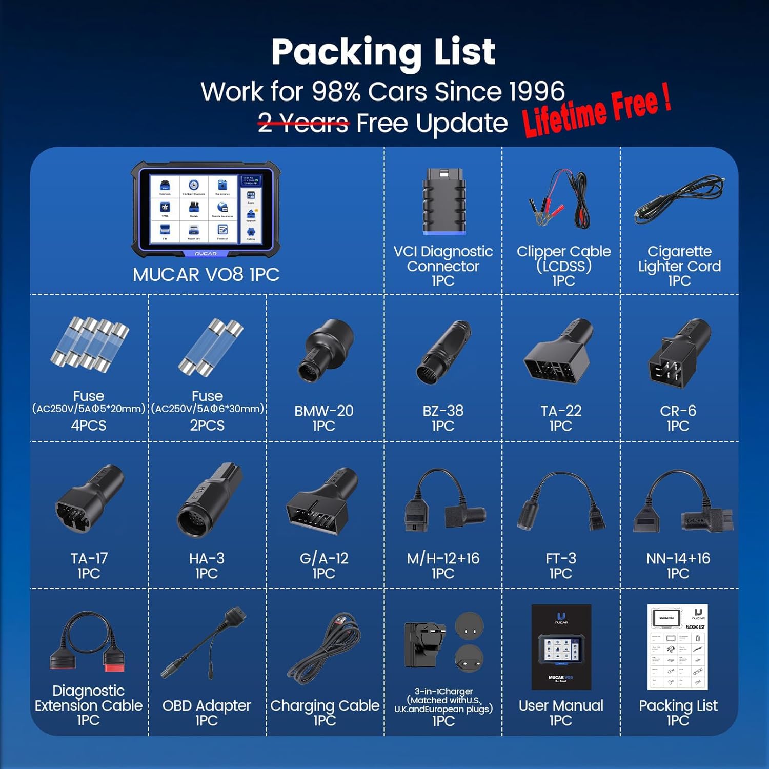 | Included Components | 1* Bluetooth (VCI) Dongle, 1* Carrying case, 1* MUCAR VO8 Bi-Directional OBD2 Scanner, 1* User Manual, 15* Connector and Adaptors, US/UK/EU Power Adapter, OBD Extension Cable, Type C Cable |