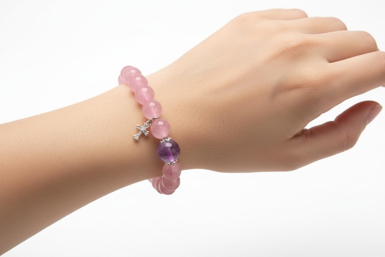 | Color | The colors of this bracelet are light pink (for most of the beads), purple (for the single large bead in the middle), and silver (for the cross - shaped pendant and the bead caps around the purple bead). |