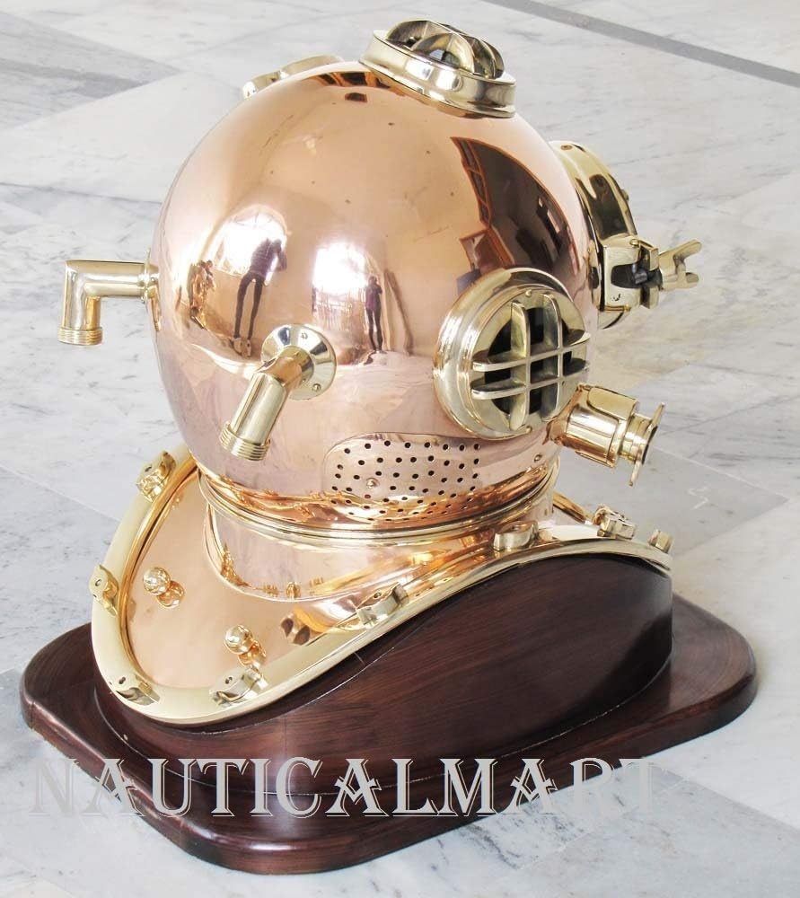 Nautical Solid Shiny Brass & Copper Divers Diving Helmet US Navy Mark V Helmet Helmet Size : L 42 X W 38 cm, Base Size : L 46.5 X W 38 cm, Total Height When Helmet Put on Base : 49 cm