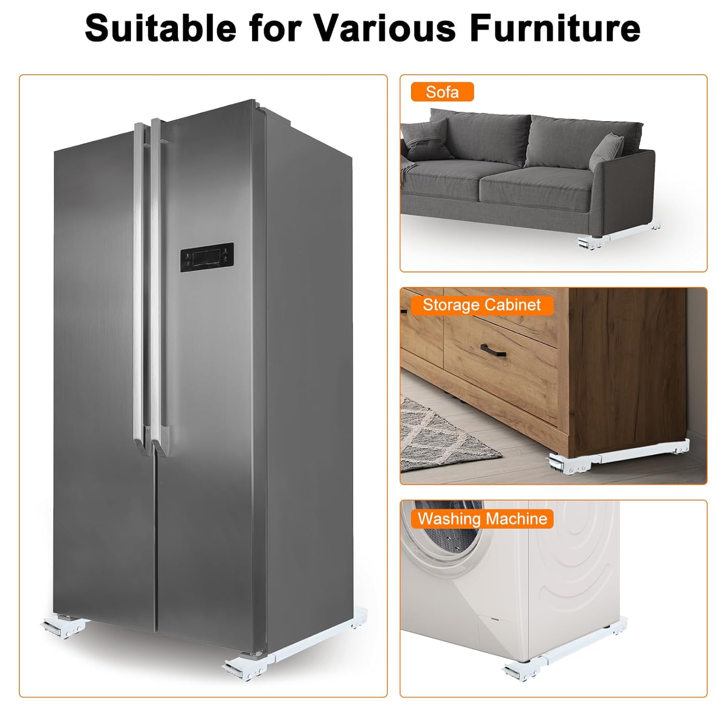 Size: With adjustable steel poles, the appliance rollers for the washer and dryer comes with 2 pack, which can be adjusted from 17.7-27.6inches/45-70cm Length and 1.6inches/4cm Height to fit different appliances and furniture, and its load capacity is 770lbs/350kg.Appliance Sliders For Large Appliances: The mobile base of the washing machine and dryer is equipped with strong wheels to increase the stress area with the floor.Strong Quality: The appliance roller is equipped with rubber anti-slid pads, which have an anti-skid, and noise reduction. They are also designed with a brake design, press to lock and lift to move.Easy To Assemble: The refrigerator sliders include strong feet and wheels, which you need to do just to assemble the connecting roller.Application: Place heavy objects washing machines, dryers, refrigerators, sofas, wardrobes, and other large furniture appliances on the moving slider, then easily move, which is convenient for daily cleaning.