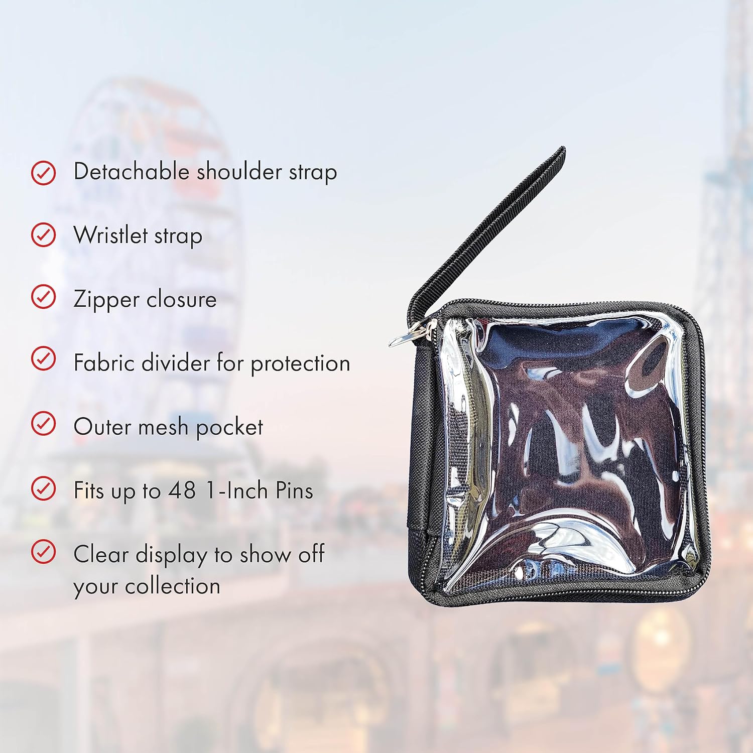 • Lightweight & Easy to Use – PinFlolio’s self-healing Stick'N'Go technology keeps pins in place without the need for pin backs. Simply flip back the fabric divider and push the pin directly into the foam page. The zipper closure, outer mesh pocket, wristlet strap, and compact design make it easy to take with you anywhere. (Size: 5.5" L x 4.5" W x 1.5" D)
