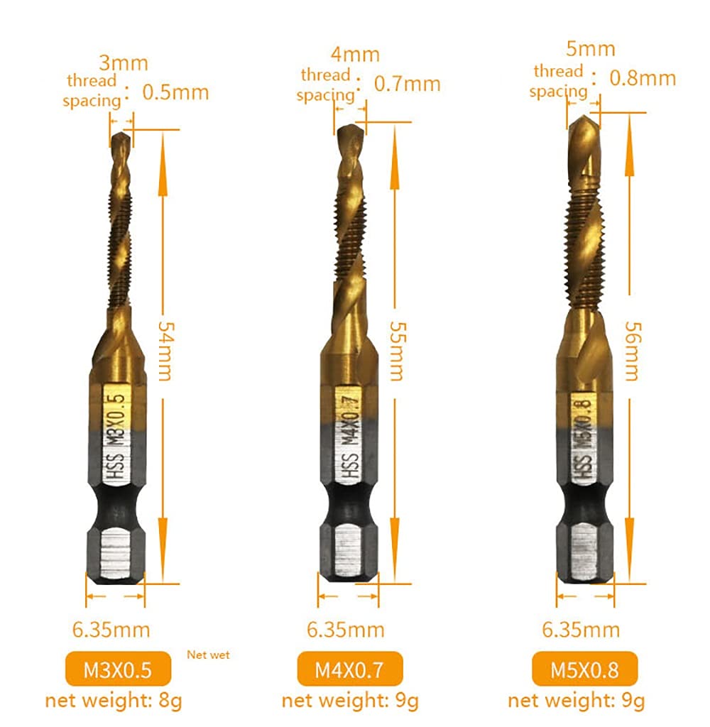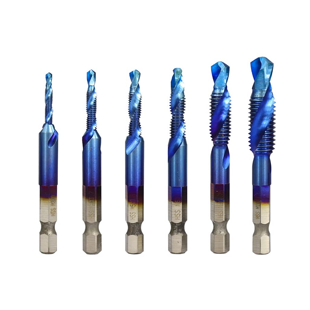 Tap Diameter: M 3x0.5mm, M4x0.7mm, M5x0.8mm, M6x1.0mm, M8x1.25mm, M10x1.5mm.Material: Hex Shank Plated HSS Screw Thread Metric Tap.Taps are designed with spiral flutes and the chip clearing process would be better.Hole tapping chamfering in , easy to operate, hand drill, bench drill, hex chuck tapping machine available.Processing: wood, plastic, aluminum, tin alloy, magnesium alloy, workpiece thickness less than 5mm.There are total 6 pieces of taps in different sizes from M 3 to M10 that you can use for tapping various threads.Note:1. Manual measuring, please allow a little 1 ~ 2mm error, thank you.2. Due to the difference between different monitors, the picture may not reflect the actual color of the item. Please allow a little color difference.Package included:1x High-speed steel Drill BitNo need for shaking or reducing friction, capable of withstanding heavy-load operations, making the cutting process smoother