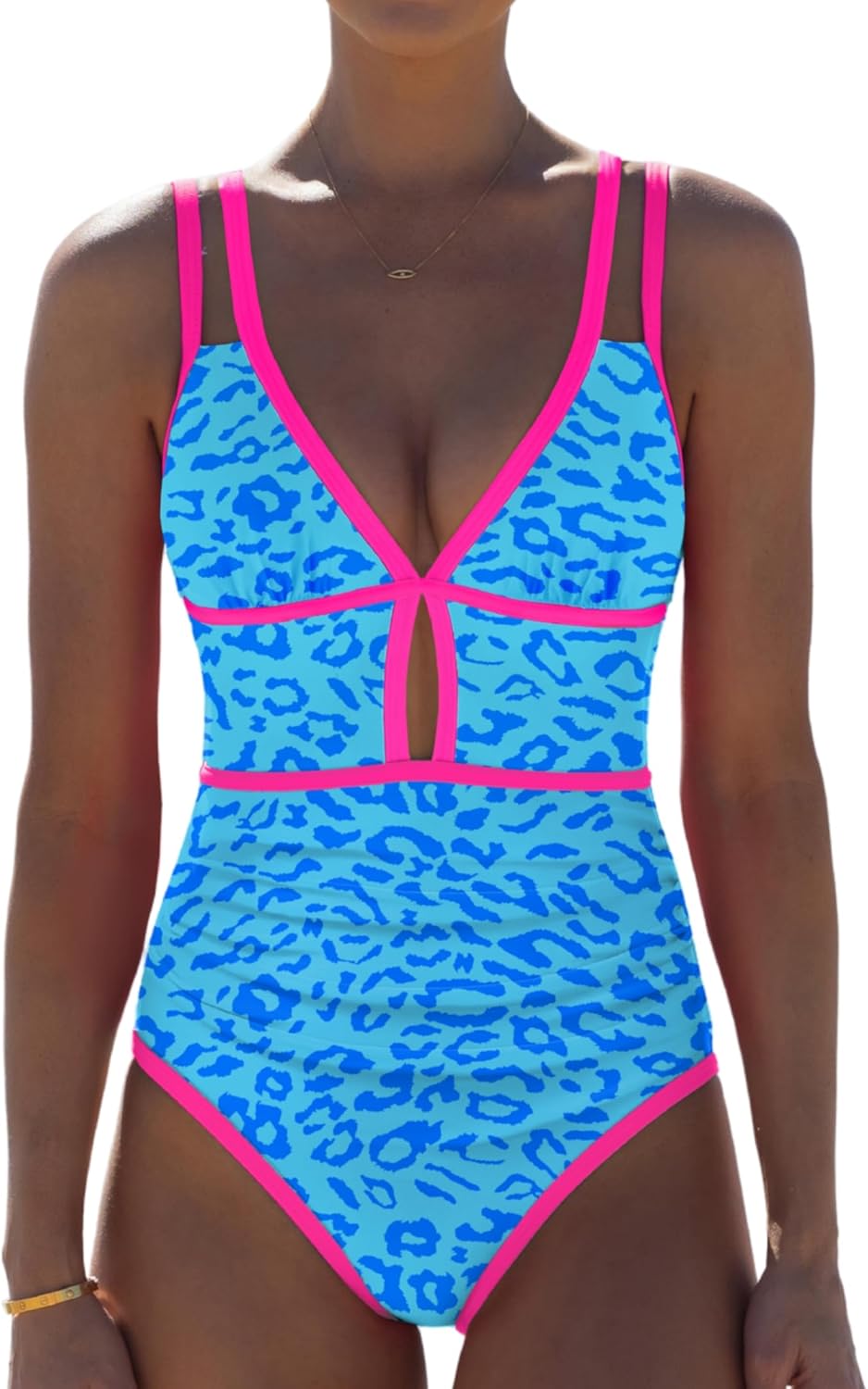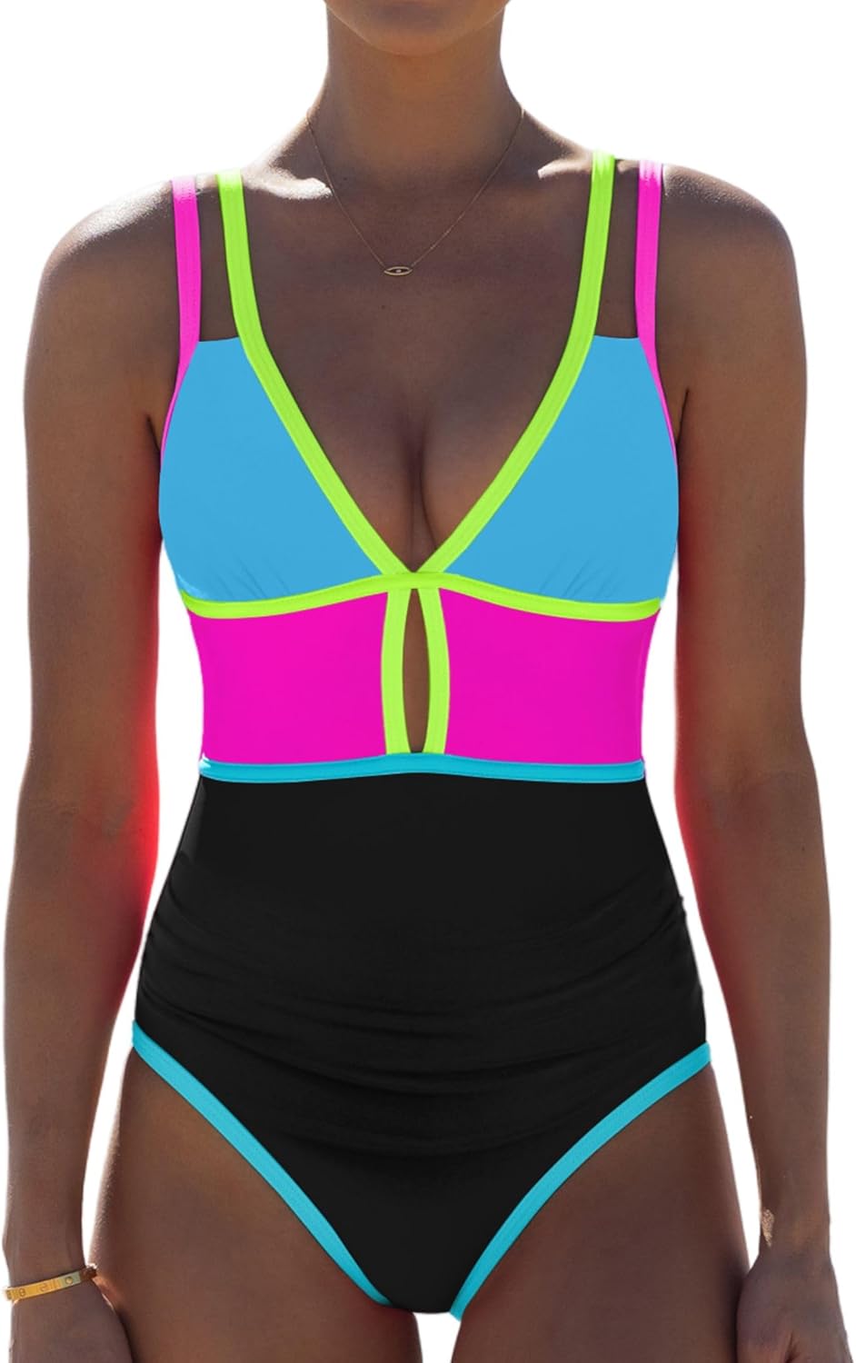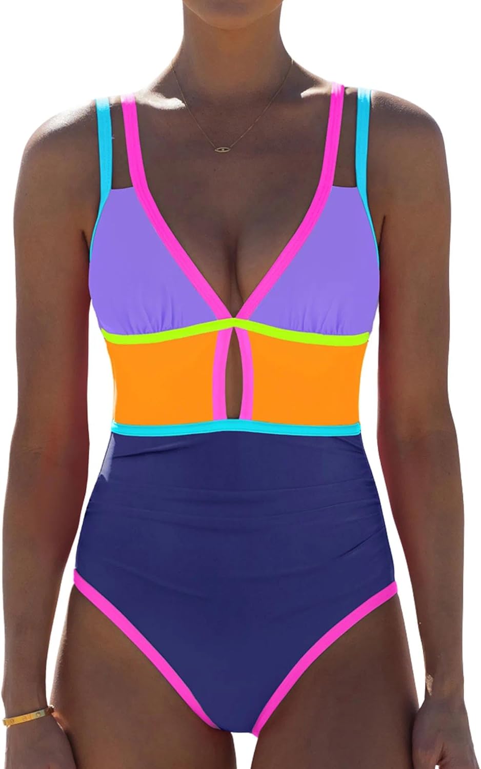 Popvil Women's One Piece SwimsuitComplete your summer closet with the Popvil Women's One Piece Swimsuit. Designed with a deep V-neckline, this sleek and sexy swimsuit is figure-flattering while providing full coverage. It will make you feel confident and slim whether you are on the beach or enjoying water sports at the pool or on the boat. The high waisted design not only enhances your natural curves, but also provides extra support for women.The V-neck one piece swimsuit is edged with neon color-blocked trim, which is a perfect blend of sweetness and sexiness.The neon colors and color blocking make it a standout choice for a beach outing, pool party, or spa day. This one piece swimsuit is available in a variety of sizes, including Small, Medium, Large and X-Large to ensure the swimsuit fits women perfectly. Whether you're a mom looking for a supportive and aesthetically pleasing swimsuit or a young woman who wants to keep up with trends, this one piece swimsuit is a great choice. It has a cute and chunky design that makes it suitable for a variety of activities, including swimming. The full coverage ensures that you feel comfortable and confident, and the clever stitching of multiple colors not only adds layers, but also adds fun and style to the overall look.