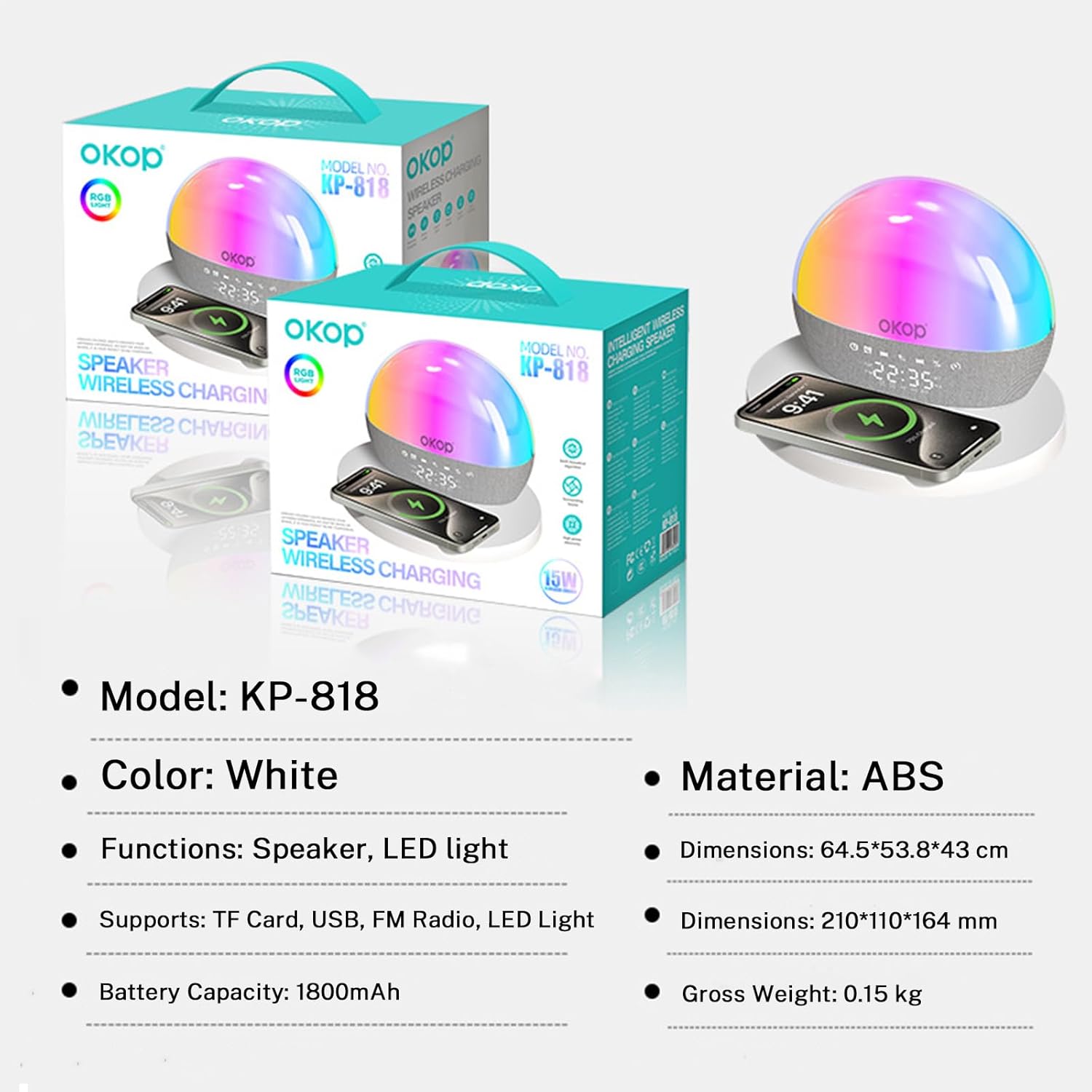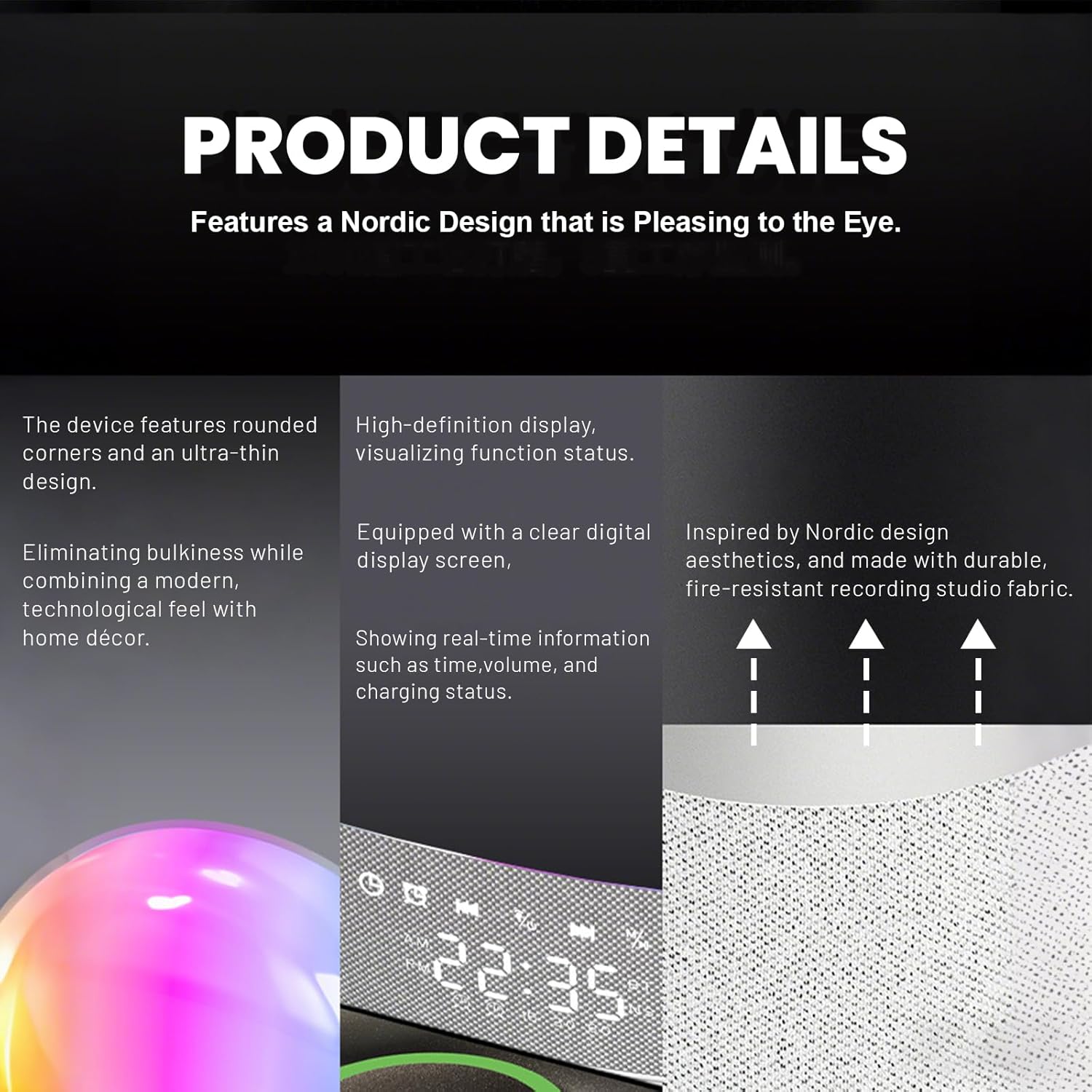 Elevate Your Daily Routine: The All-in-One Sound & Sleep CompanionTransform your bedside table into a hub of tranquility and functionality. This Portable Bluetooth Speaker is meticulously engineered to be far more than just a sound system.It integrates premium audio, intelligent time management, a serene sleep aid,and convenient wireless charging into one elegantly designed device. With its Nordic-inspired, slim-profile aesthetic, it complements any modern space—bedroom,home office, or living area—seamlessly blending technology with your lifestyle for a harmonious daily experience.Product Specifications:Product Dimensions: 8.2 x 4.3 x 6.4 in / 21 x 11 x 16.4 cmProduct Weight: 3.14 lb / 1425 gConnectivity: Bluetooth 5.4Wireless Charging Output: 15W (Qi Standard)Audio Output: Dual 5W Drivers + 1 DiaphragmBattery Capacity: 1800mAh Rechargeable Lithium BatteryPlayback Time: Up to 6 hours (varies by volume)Charging Time: 2-3 hours (via USB)Wireless Range: 33 ft / 10 mPlayback Modes: Bluetooth, USB, TF CardWhite Noise: 24 Built-in SoundsDisplay: Digital LED DisplayAlarms: 2 Independent Alarms with Adjustable VolumeMaterial: ABSWaterproof Rating: Not waterproofPackage Includes:Portable Bluetooth Speaker x 1Detachable Wireless Charging Base x 1USB Charging Cable x 1User Manual x 1Simplify your space and enhance every momentfrom your first morning alarm to your last thought before sleep. This multifunctional speaker is the thoughtful upgrade your daily rhythm deserves,offering exceptional value, beautiful design, and thoughtful convenience in one compact package.