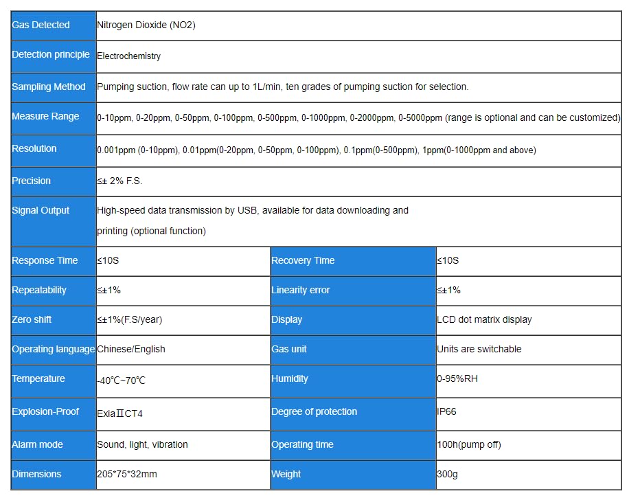 Accurately detect dangerous nitrogen dioxide leaks with the advanced SKY2000-NO2 portable gas monitor. The customizable electrochemical sensor provides rapid NO2 detection from 0-2000ppm. Readings display on the clear LCD in real-time along with gas type, units, time, and temperature.With a fast ≤10 second response time and high ±2% precision, this detector alerts you to NO2 threats quickly and accurately. It meets explosion-proof ExiaIICT4 standards and has an IP66 rating for use in hazardous industrial environments.Key features: - 0-2000ppm NO2 range - ≤10s response time - ±2% precision - LCD dot matrix display - ExiaIICT4 explosion-proof - IP66 rating - Sound, light, vibration alarmsRugged and reliable, the SKY2000-NO2 portable NO2 detector provides the gas monitoring performance and safety you need in demanding conditions.