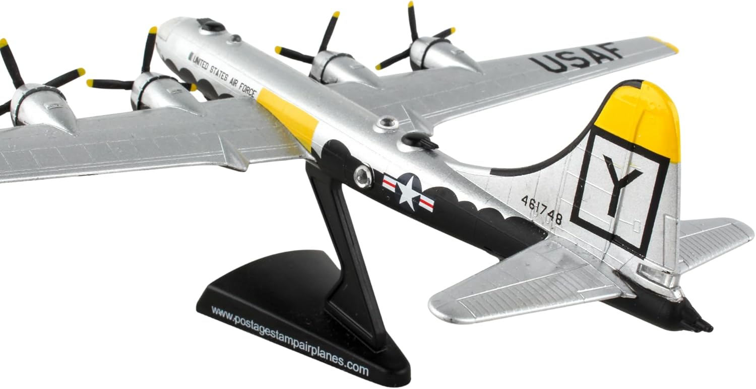This die-cast metal model comes in 1/200 scale with plastic stand. Model is approximately 6 inches long with 8 1/8 inch wingspan. B-29 SuperfortressTM "It's Hawg Wild" (1:200) The B-29 Superfortress was a four-engine, propeller-driven heavy bomber, and one of the largest aircraft used in World War II. An advanced bomber for its time, its features included remote-controlled machine gun turrets and a pressurized cabin which allowed for high-altitude flight. It was famously used for dropping the atomic bomb in Hiroshima and Nagasaki. "It's Hawg Wild" was assigned to the 371st Bombardment Squadron stationed in Kadena Air Base, Okinawa in 1952. It flew 105 missions over North Korea before the Korean armistice agreement in 1953. It was sent to China Lake, CA for decommissioning before it was donated to the Imperial Air Museum and fully restored to its wartime color scheme. It is currently on permanent indoor display at the American Air Museum in Duxford England.