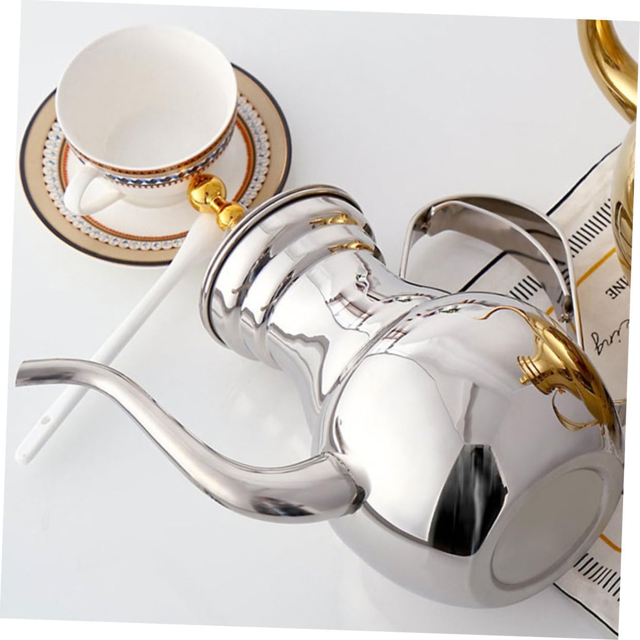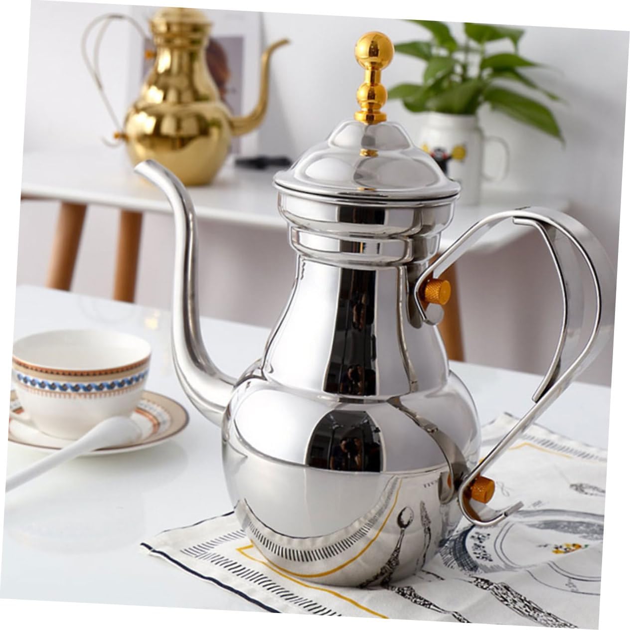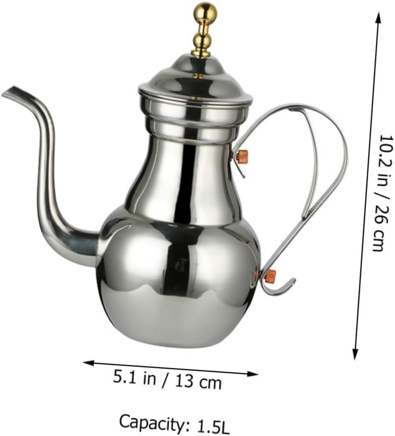 Package Include 1 x Coffee Kettle Characteristics -Material:Stainless Steel coffee pot -Product Info:Stainless steel teapot -Color:Silver coffee brewing pot -Capacity:1.5L delicate filter kettle -Size:26.50X13.00X9.00cm/10.41X5.11X3.54in metal tea kettle -There is a filter mesh in this coffee pot, which can help you filter coffee or tea residue coffee serving pot. -Stable material, surface, anti-wear, internal healthy material, high-temperature resistance, easy to clean, coffee pots. -Fine workmanship and beautiful appearance, its popularity and utility metal kettle. -Long spout has a precise water control, precise and delicate, flow diversion convenient coffee pot. -Simple shape, unique design, easy to use. Make you enjoy the comfortable brought by teapot tea kettle.Goods Descriptioncoffee serving teapot Creative appearance design and Middle Eastern style design, which is also a good decoration.kettle for coffee The long spout is designed for easy dumping and has a comfortable handle.metal teapot This is a long spout hand-made coffee pot, made of stable stainless steel, wear-resistant and not easy to rust